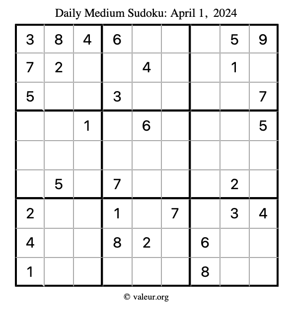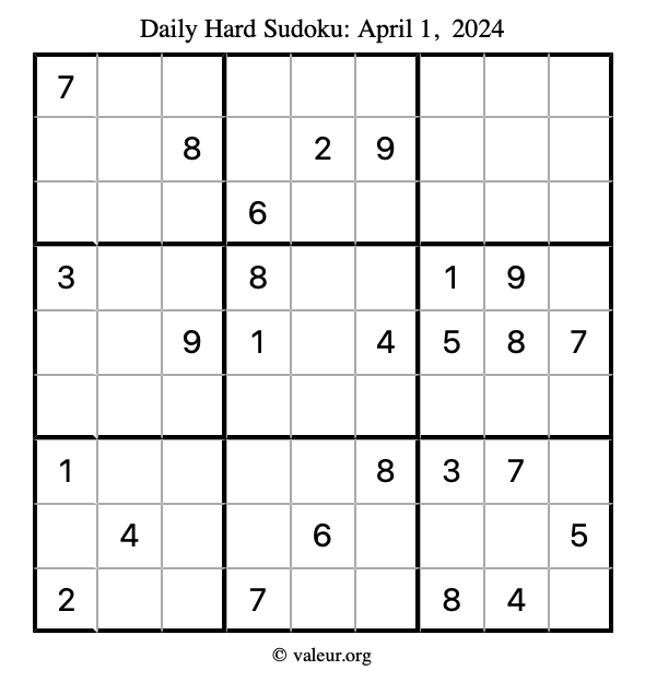 Daily Four Sudoku Puzzles April 1, 2024 is not the only daily set of sudoku puzzles we have. We create four sudoku puzzles every day for you to print and solve. Check out today's set of four sudoku puzzles here!