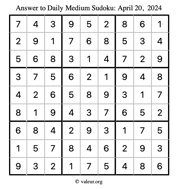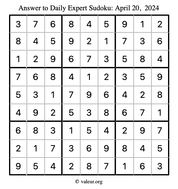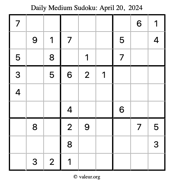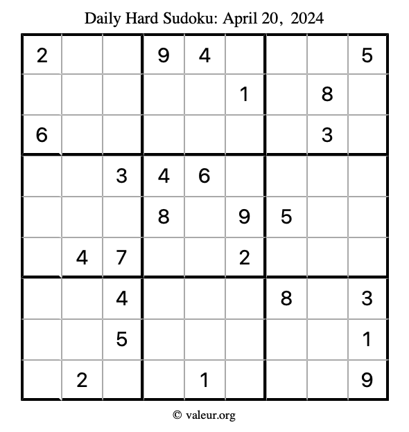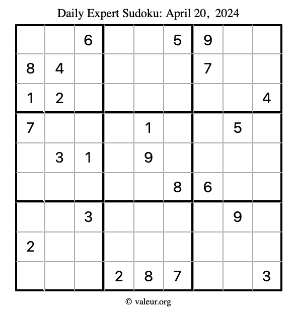 Daily Four Sudoku Puzzles April 20, 2024 is not the only daily set of sudoku puzzles we have. We create four sudoku puzzles every day for you to print and solve. Check out today's set of four sudoku puzzles here!