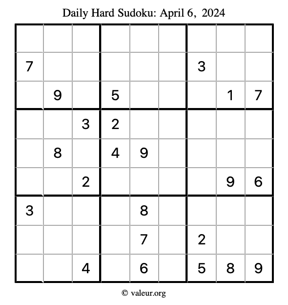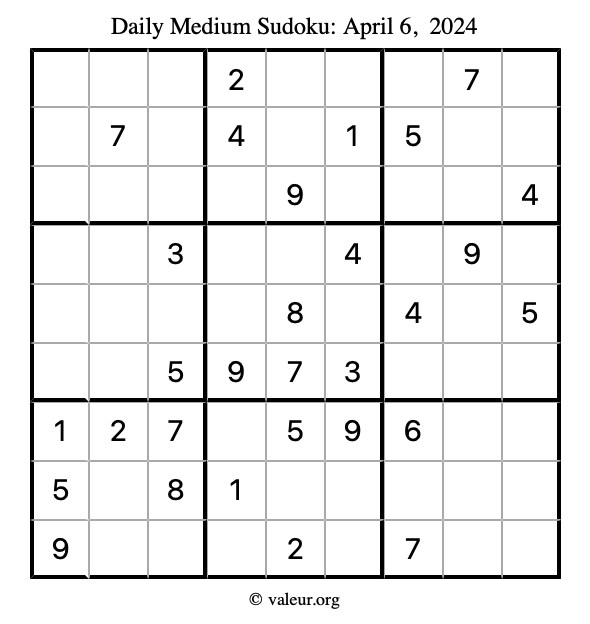 Daily Four Sudoku Puzzles April 6, 2024 is not the only daily set of sudoku puzzles we have. We create four sudoku puzzles every day for you to print and solve. Check out today's set of four sudoku puzzles here!