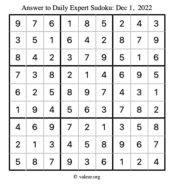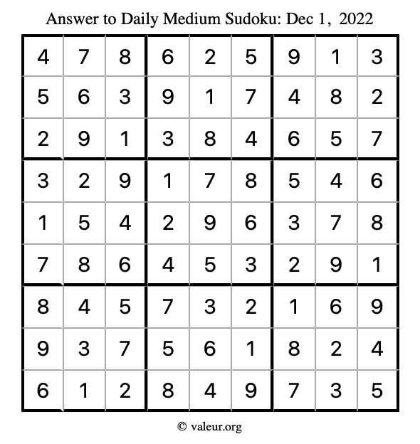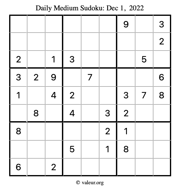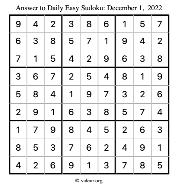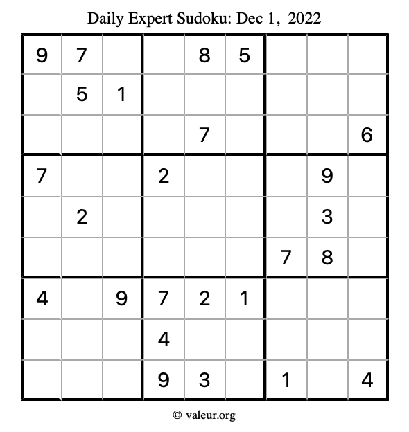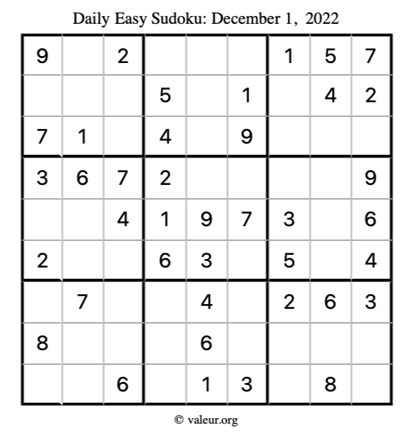 Here are the December 1, 2022 daily four sudoku puzzles. You are welcome to print a copy of the puzzles and solve them by hand. For your convenience, we have also included the solutions further down the page so you can check your work.
