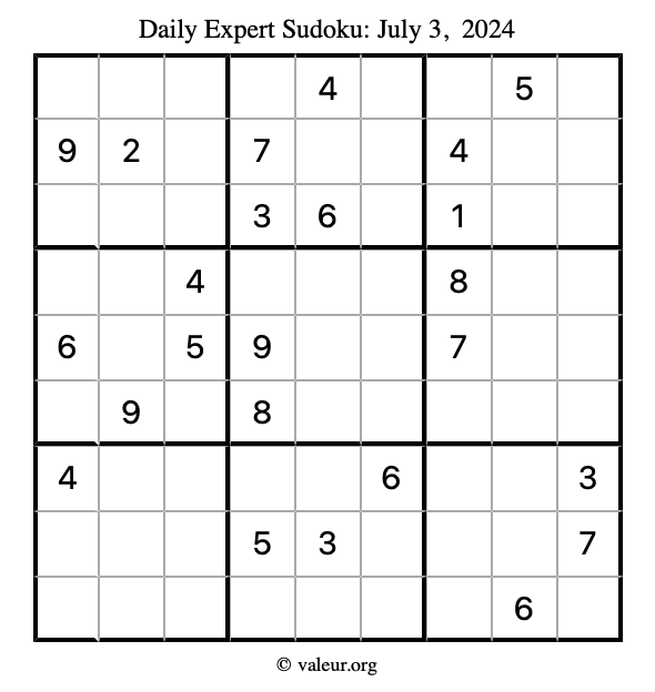 Here are the July 3, 2024 daily four sudoku puzzles. You are welcome to print a copy of the puzzles and solve them by hand. For your convenience, we have also included the solutions further down the page so you can check your work.