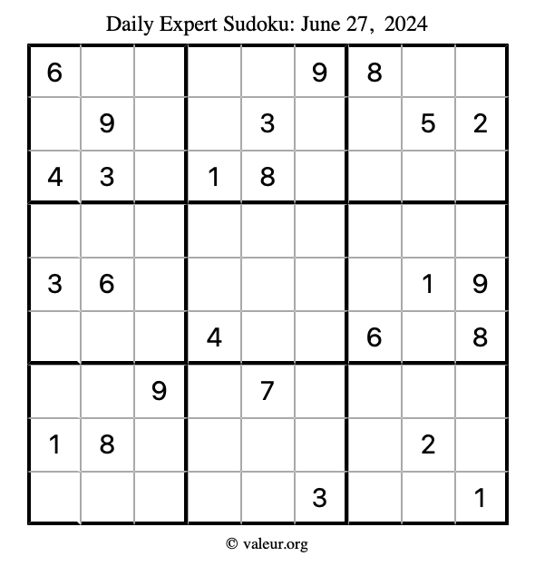 Here are the June 27, 2024 daily four sudoku puzzles. You are welcome to print a copy of the puzzles and solve them by hand. For your convenience, we have also included the solutions further down the page so you can check your work.