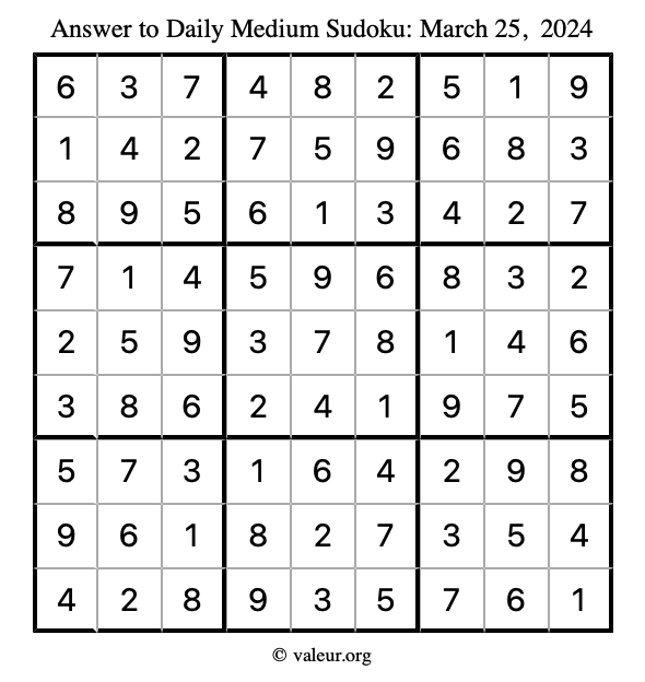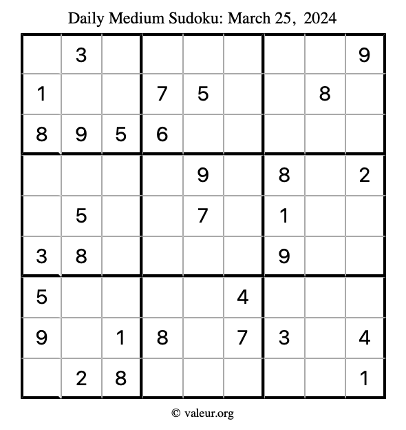 Daily Four Sudoku Puzzles March 25, 2024 is not the only daily set of sudoku puzzles we have. We create four sudoku puzzles every day for you to print and solve. Check out today's set of four sudoku puzzles here!