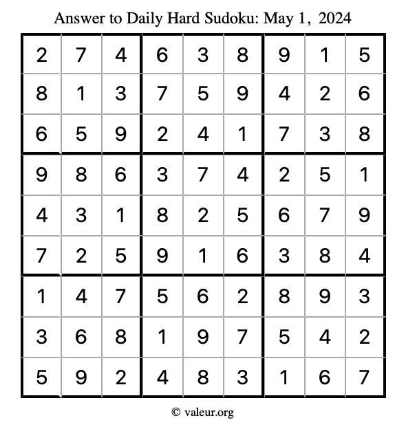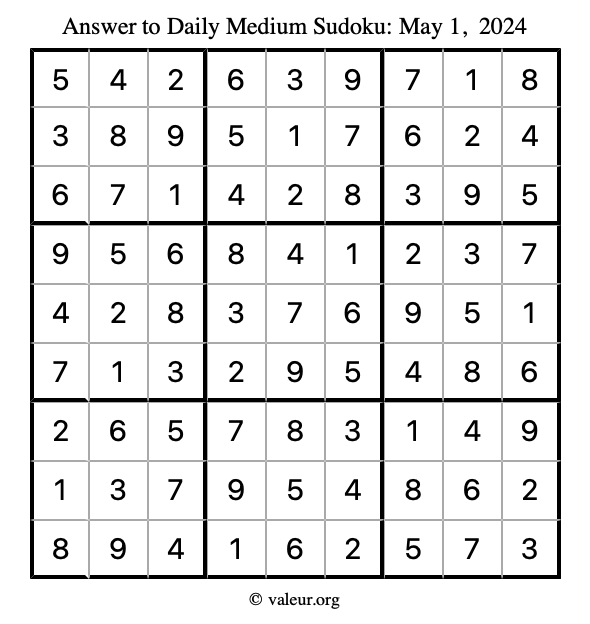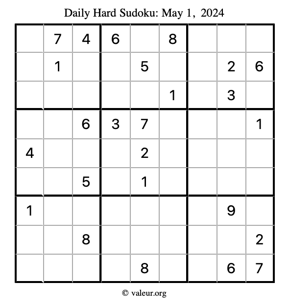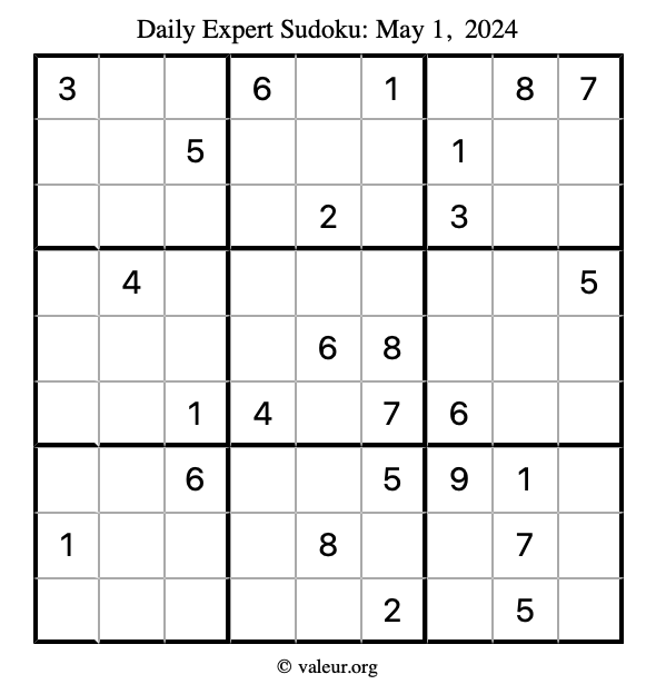 Here are the May 1, 2024 daily four sudoku puzzles. You are welcome to print a copy of the puzzles and solve them by hand. For your convenience, we have also included the solutions further down the page so you can check your work.