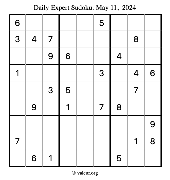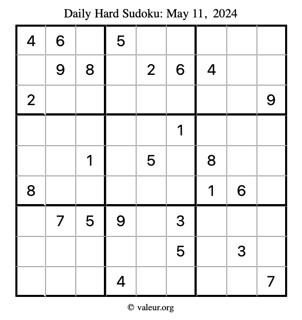 Here are the May 11, 2024 daily four sudoku puzzles. You are welcome to print a copy of the puzzles and solve them by hand. For your convenience, we have also included the solutions further down the page so you can check your work.
