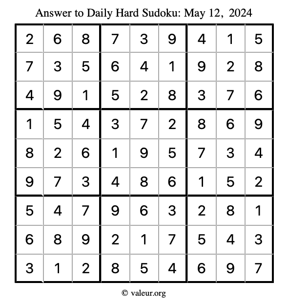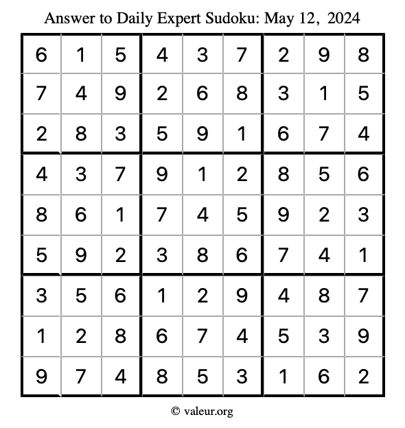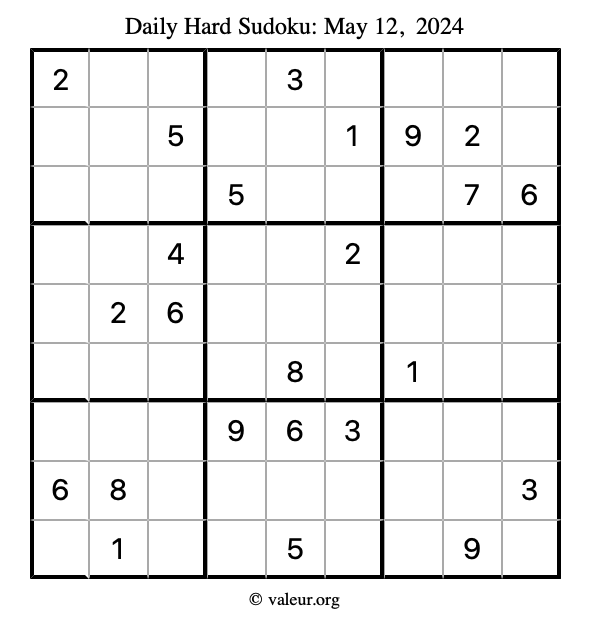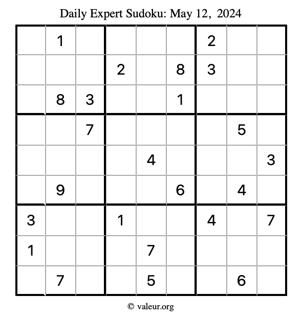Here are the May 12, 2024 daily four sudoku puzzles. You are welcome to print a copy of the puzzles and solve them by hand. For your convenience, we have also included the solutions further down the page so you can check your work.