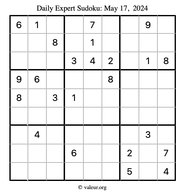 Here are the May 17, 2024 daily four sudoku puzzles. You are welcome to print a copy of the puzzles and solve them by hand. For your convenience, we have also included the solutions further down the page so you can check your work.