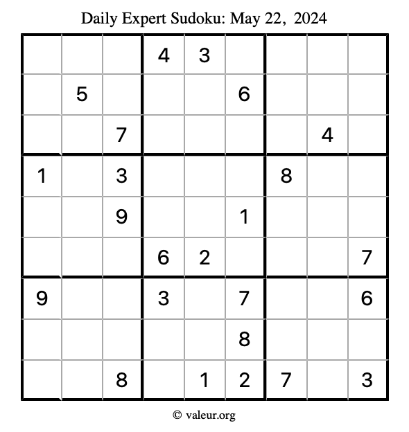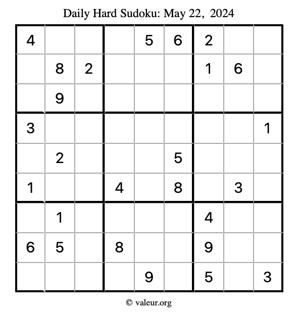 Here are the May 22, 2024 daily four sudoku puzzles. You are welcome to print a copy of the puzzles and solve them by hand. For your convenience, we have also included the solutions further down the page so you can check your work.