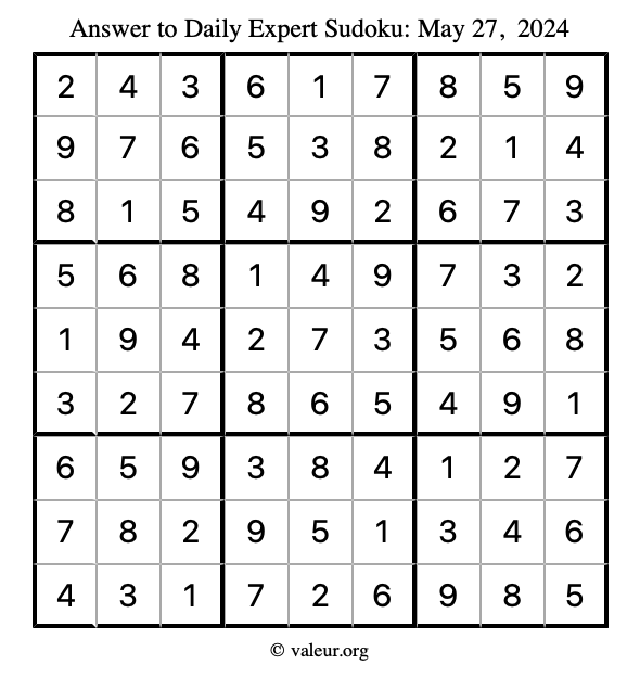 Here are the May 27, 2024 daily four sudoku puzzles. You are welcome to print a copy of the puzzles and solve them by hand. For your convenience, we have also included the solutions further down the page so you can check your work.