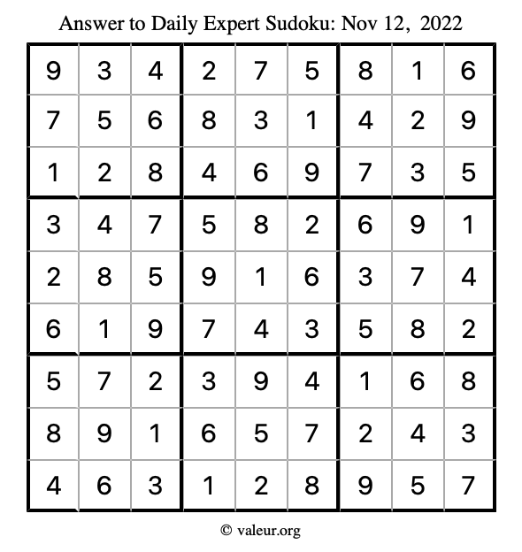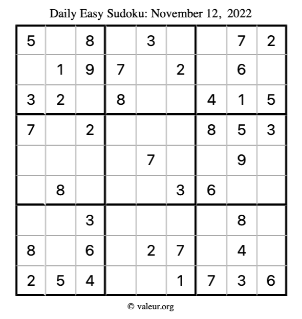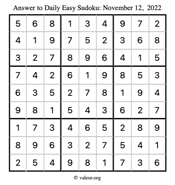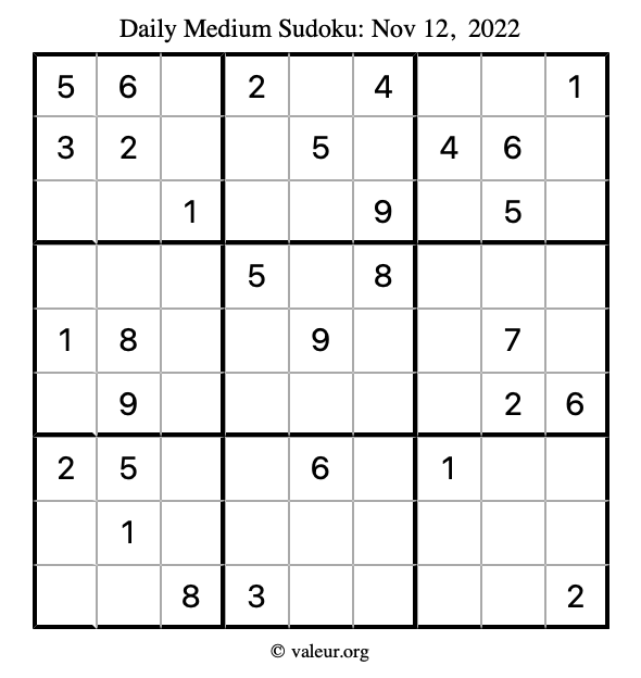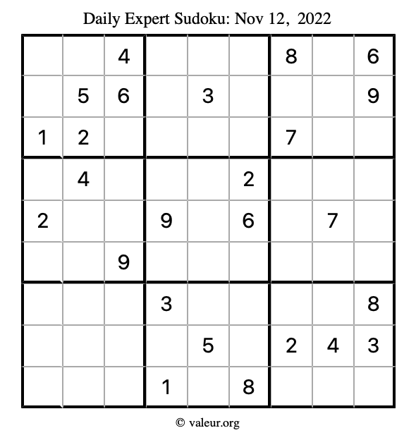 Here are the November 12, 2022 daily four sudoku puzzles. You are welcome to print a copy of the puzzles and solve them by hand. For your convenience, we have also included the solutions further down the page so you can check your work.