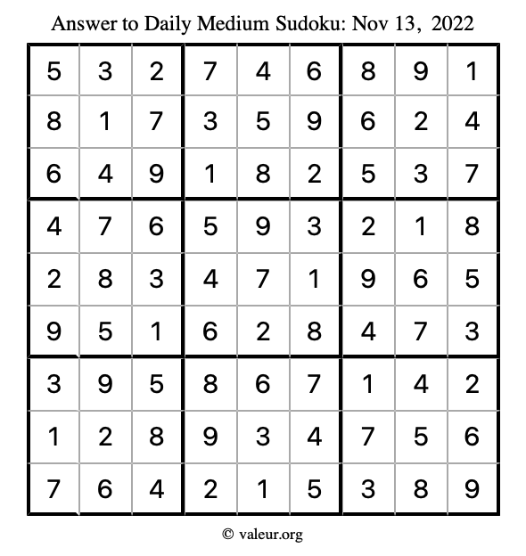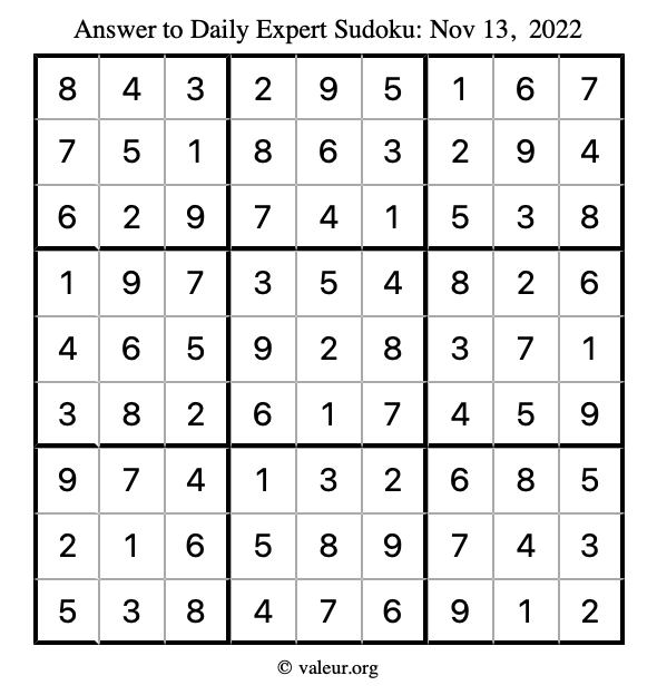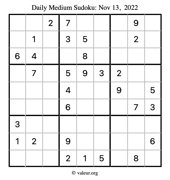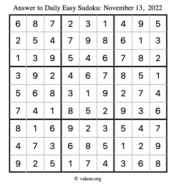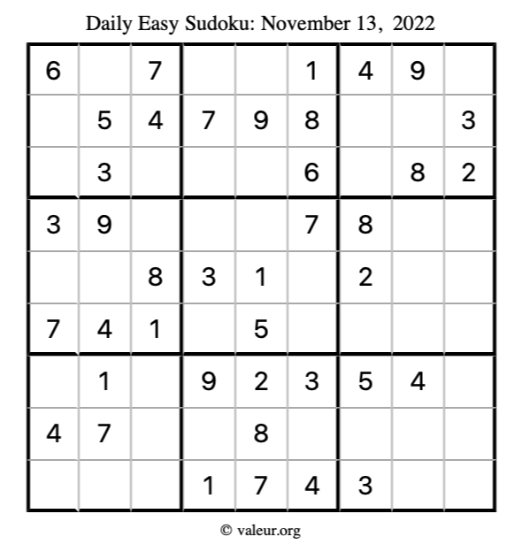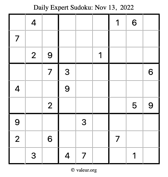 Here are the November 13, 2022 daily four sudoku puzzles. You are welcome to print a copy of the puzzles and solve them by hand. For your convenience, we have also included the solutions further down the page so you can check your work.