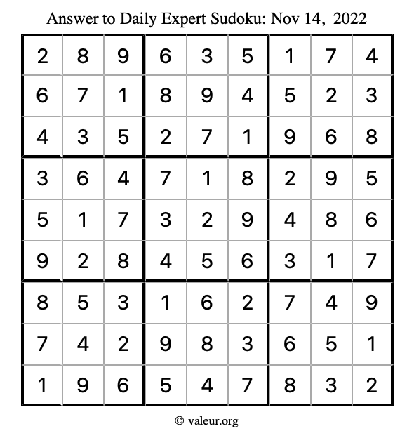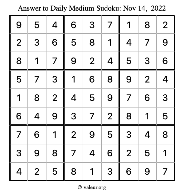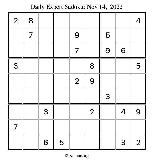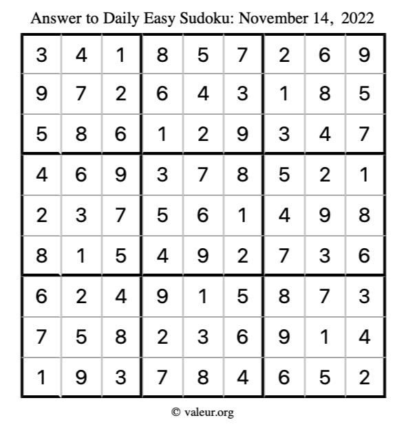 Here are the November 14, 2022 daily four sudoku puzzles. You are welcome to print a copy of the puzzles and solve them by hand. For your convenience, we have also included the solutions further down the page so you can check your work.