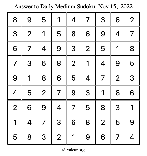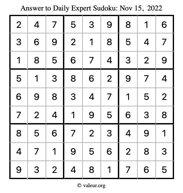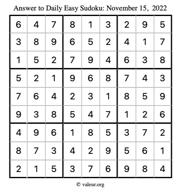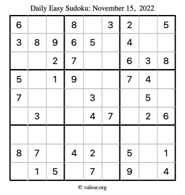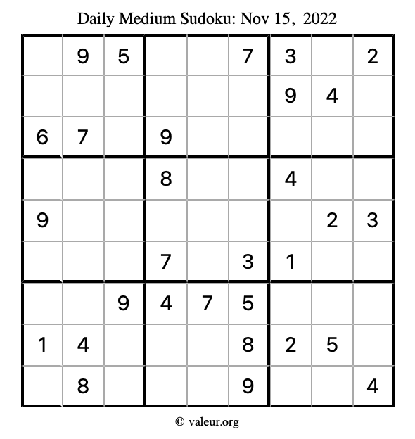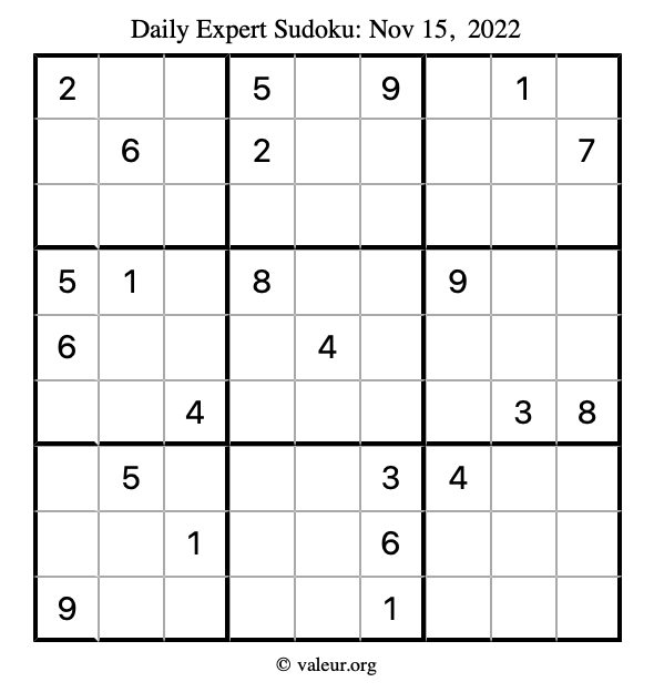 Here are the November 15, 2022 daily four sudoku puzzles. You are welcome to print a copy of the puzzles and solve them by hand. For your convenience, we have also included the solutions further down the page so you can check your work.