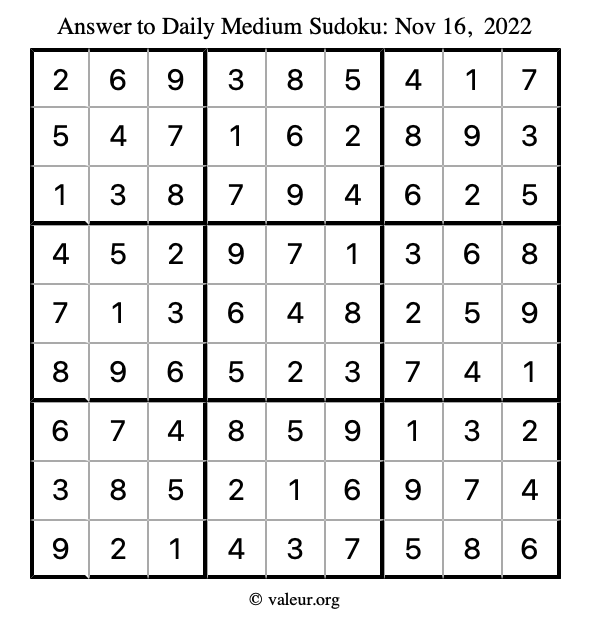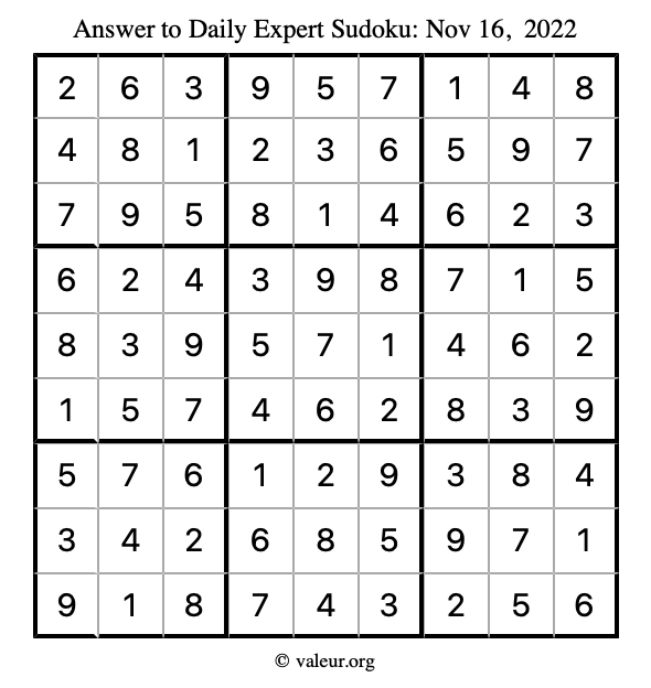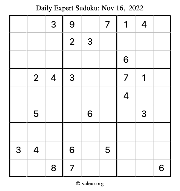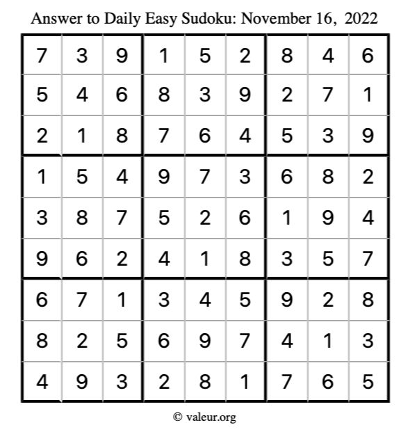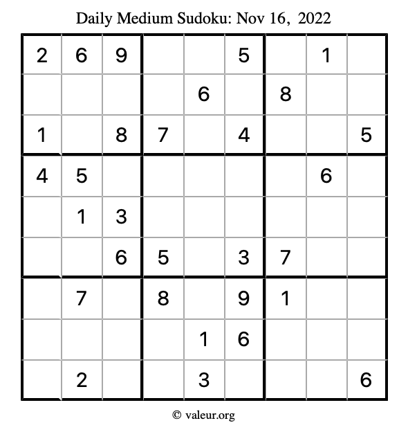 Here are the November 16, 2022 daily four sudoku puzzles. You are welcome to print a copy of the puzzles and solve them by hand. For your convenience, we have also included the solutions further down the page so you can check your work.