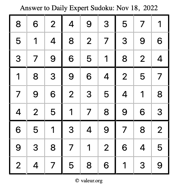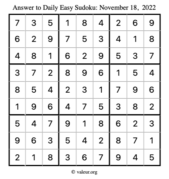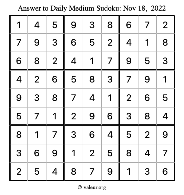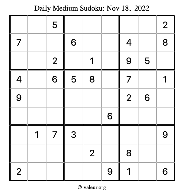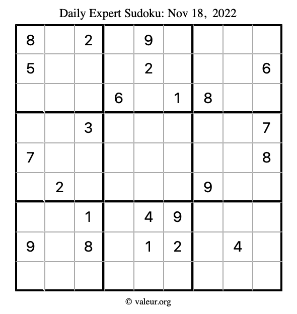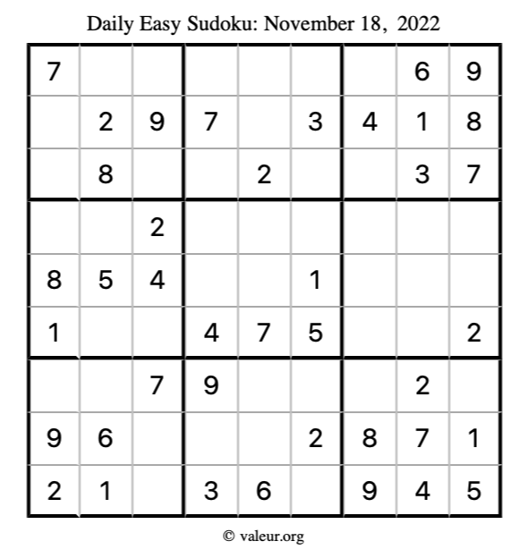 Here are the November 18, 2022 daily four sudoku puzzles. You are welcome to print a copy of the puzzles and solve them by hand. For your convenience, we have also included the solutions further down the page so you can check your work.