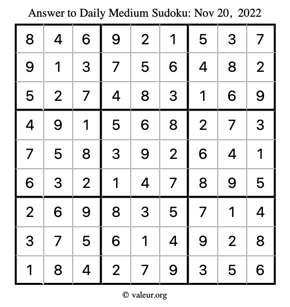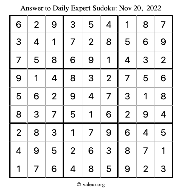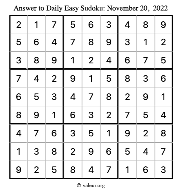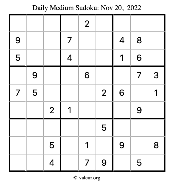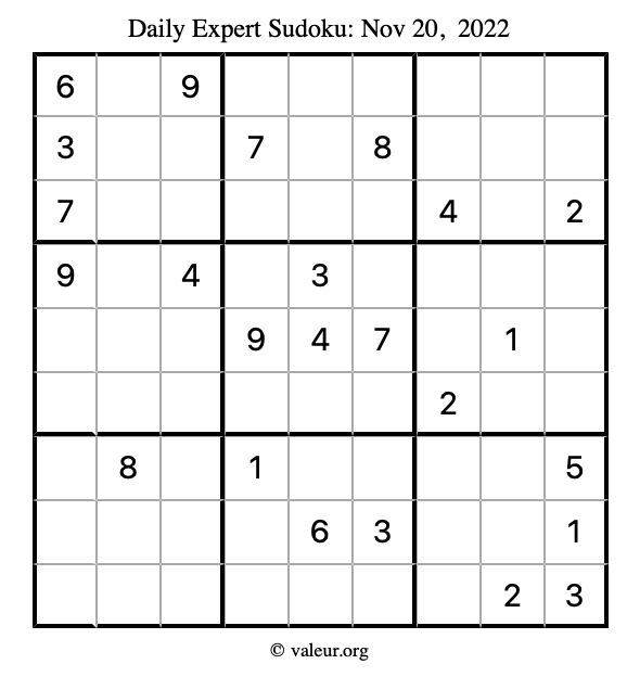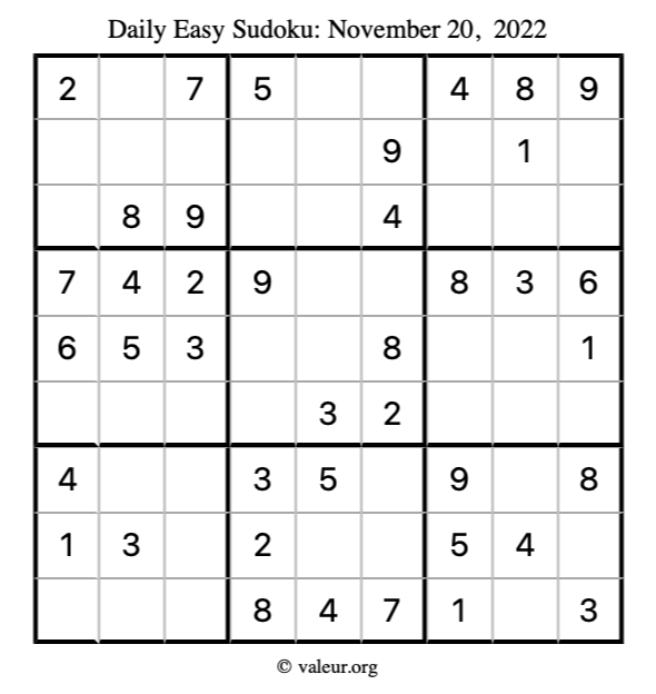 Here are the November 20, 2022 daily four sudoku puzzles. You are welcome to print a copy of the puzzles and solve them by hand. For your convenience, we have also included the solutions further down the page so you can check your work.