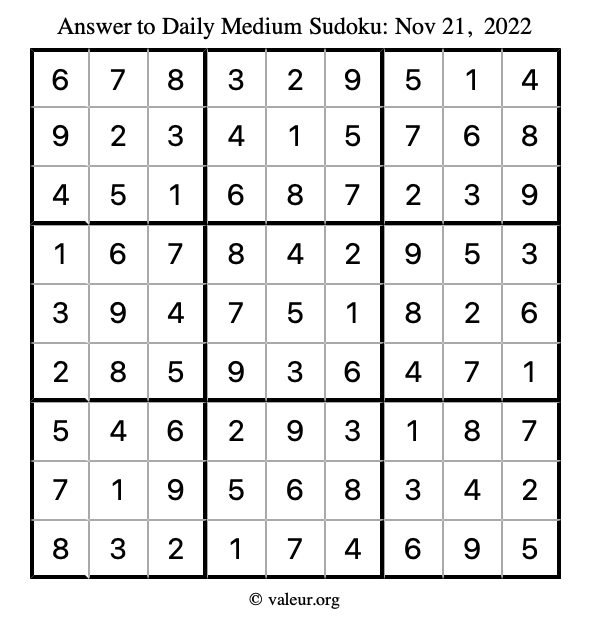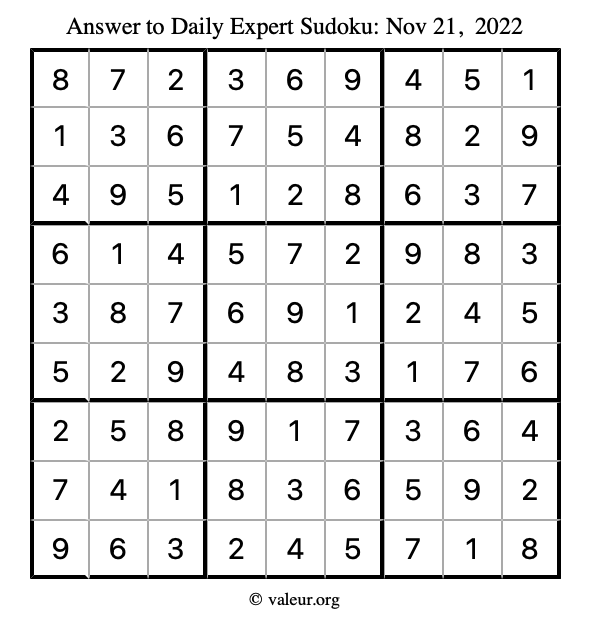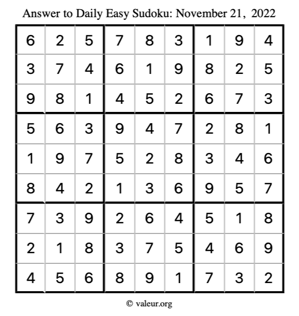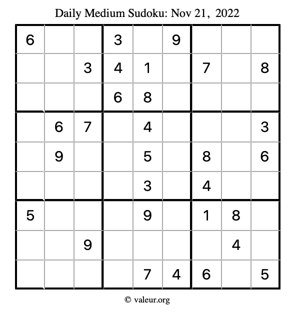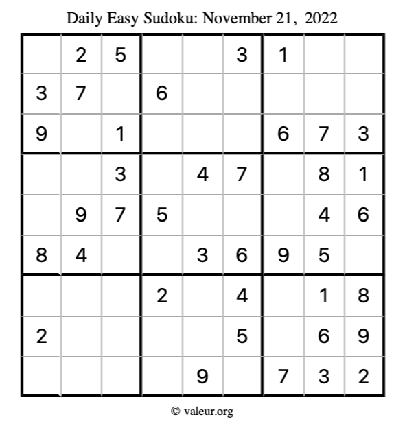 Here are the November 21, 2022 daily four sudoku puzzles. You are welcome to print a copy of the puzzles and solve them by hand. For your convenience, we have also included the solutions further down the page so you can check your work.