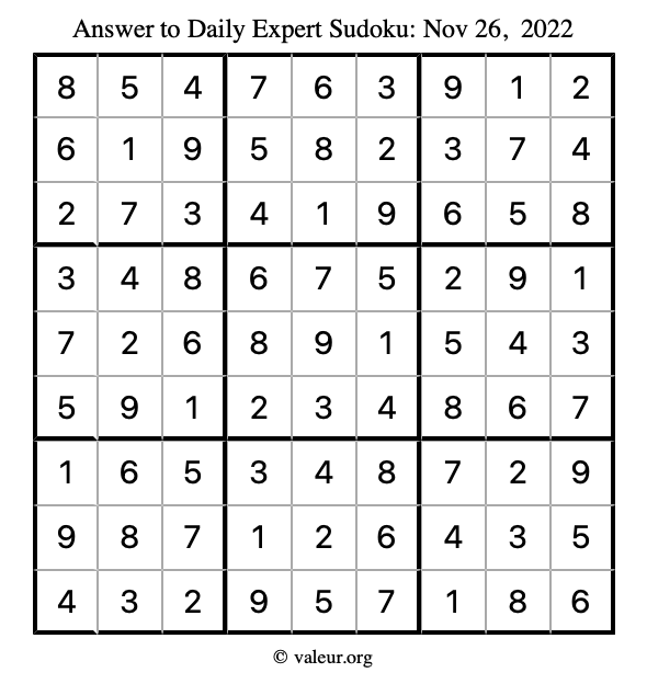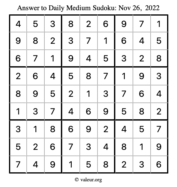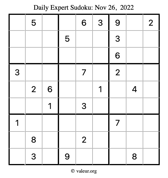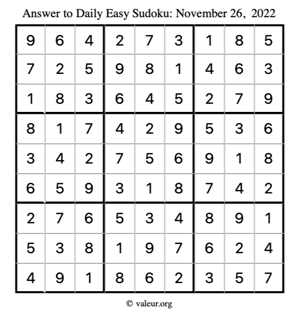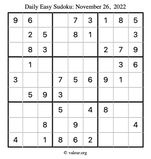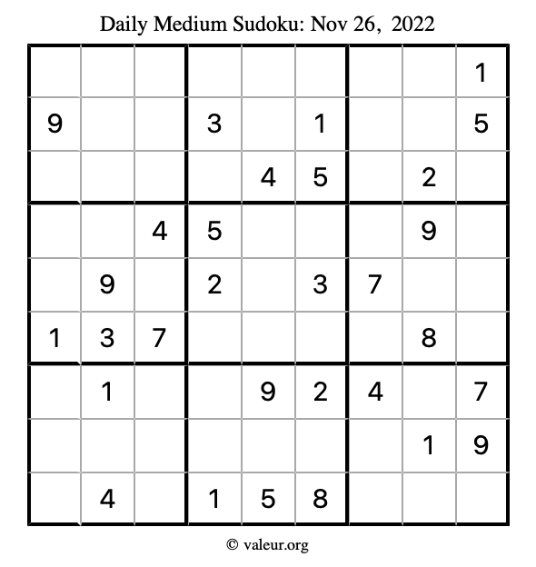 Here are the November 26, 2022 daily four sudoku puzzles. You are welcome to print a copy of the puzzles and solve them by hand. For your convenience, we have also included the solutions further down the page so you can check your work.