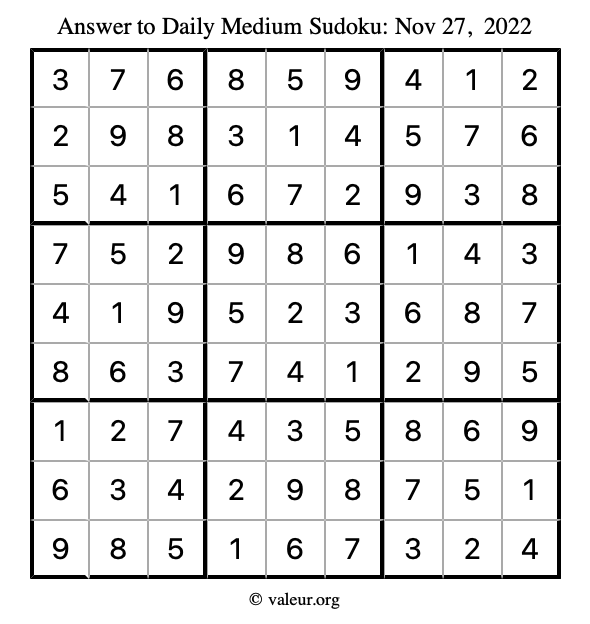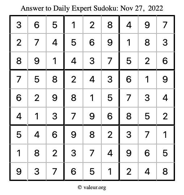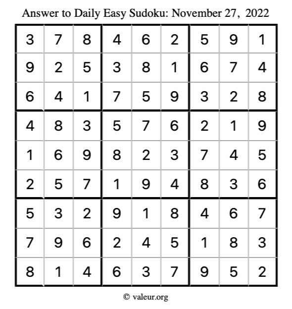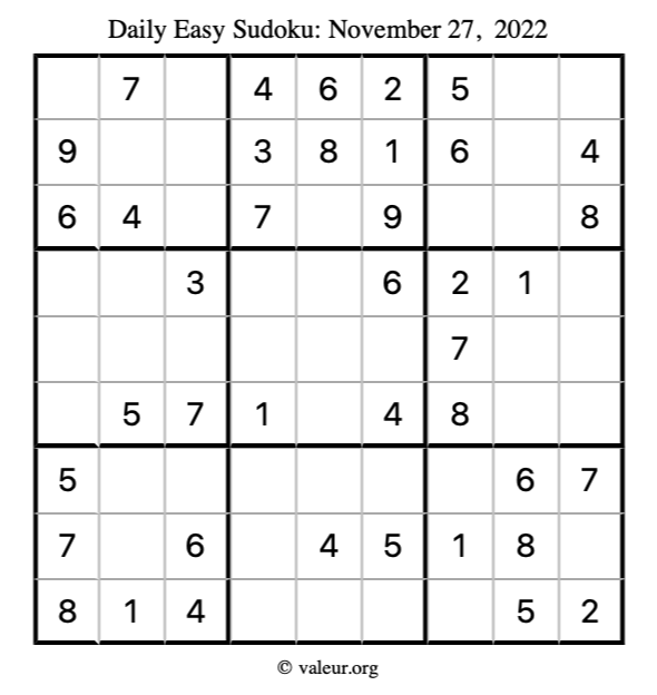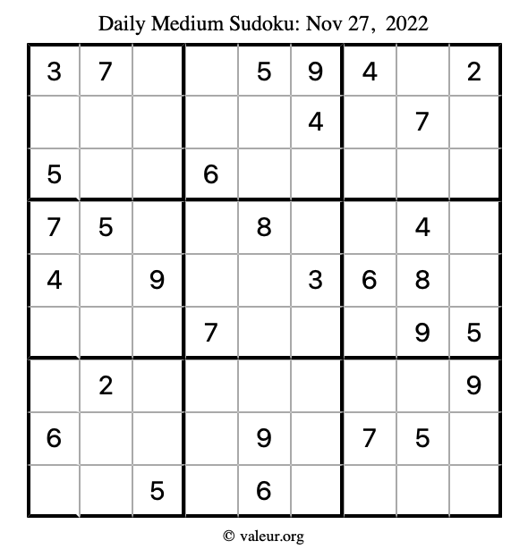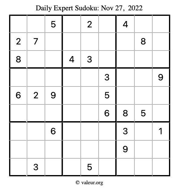 Here are the November 27, 2022 daily four sudoku puzzles. You are welcome to print a copy of the puzzles and solve them by hand. For your convenience, we have also included the solutions further down the page so you can check your work.