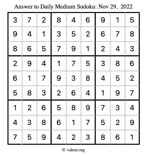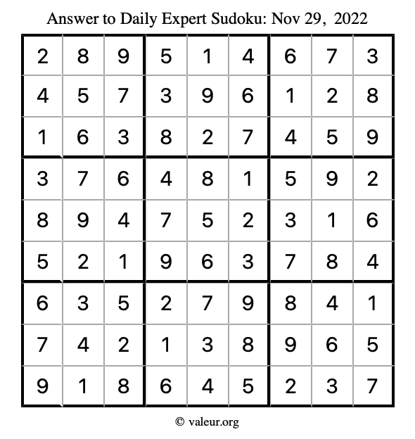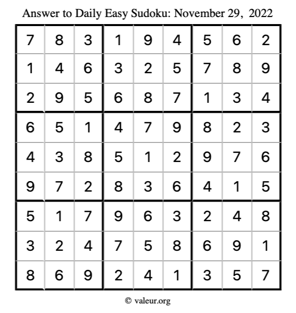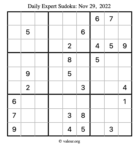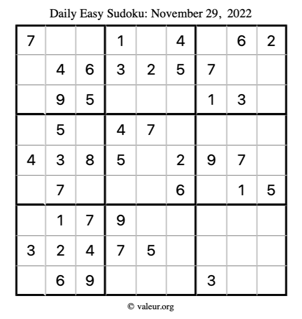 Here are the November 29, 2022 daily four sudoku puzzles. You are welcome to print a copy of the puzzles and solve them by hand. For your convenience, we have also included the solutions further down the page so you can check your work.