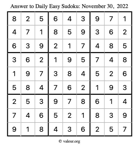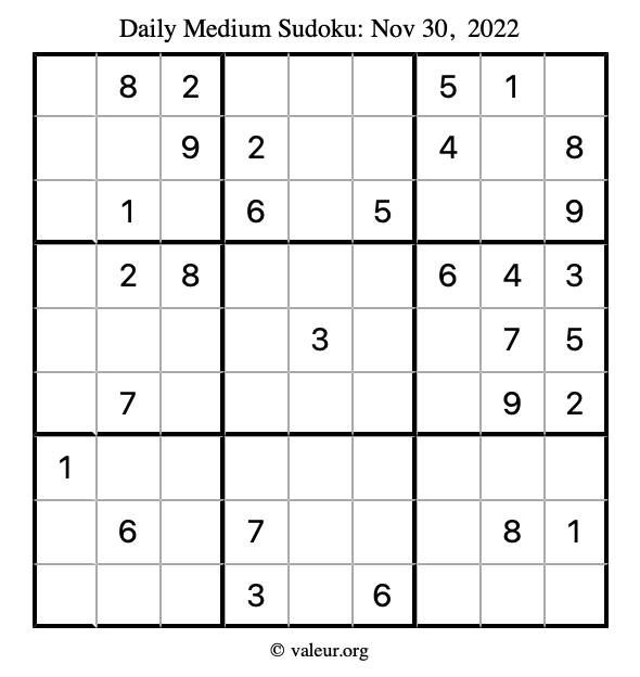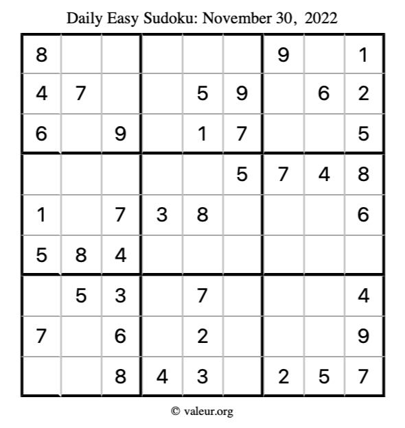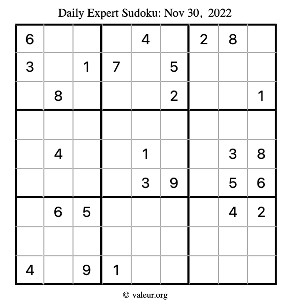 Here are the November 30, 2022 daily four sudoku puzzles. You are welcome to print a copy of the puzzles and solve them by hand. For your convenience, we have also included the solutions further down the page so you can check your work.
