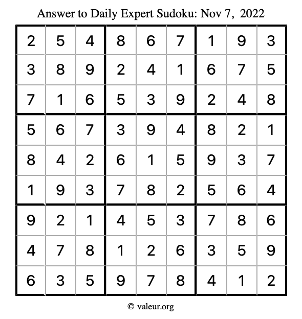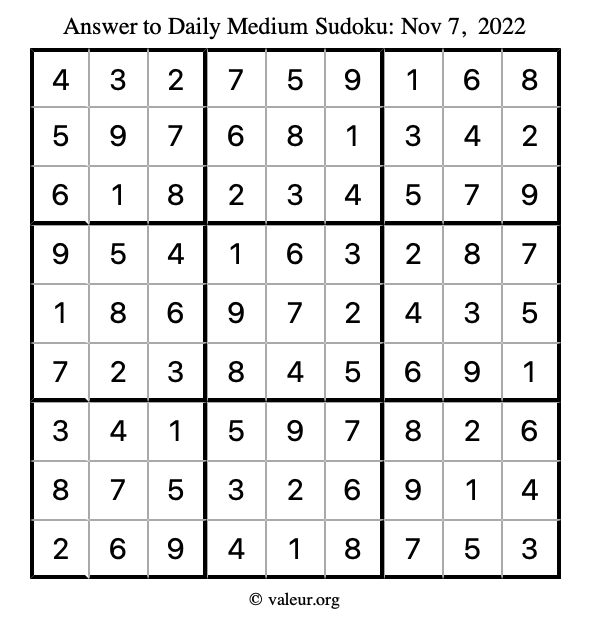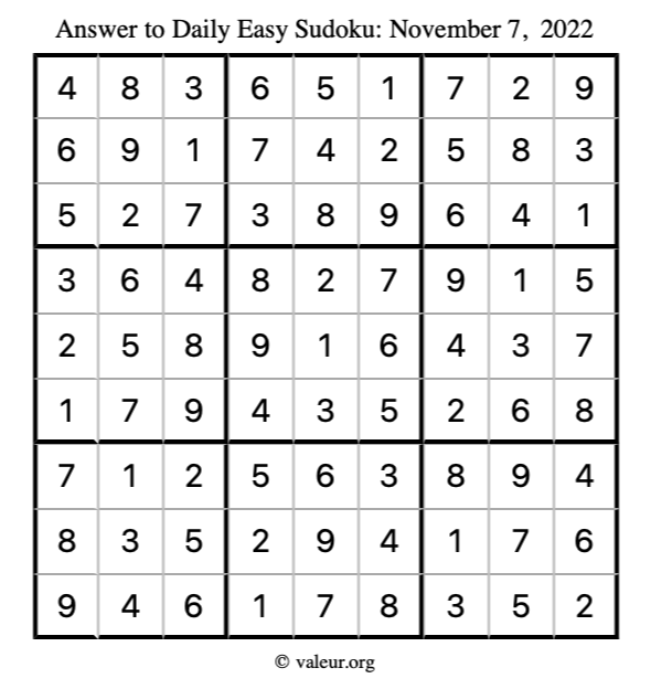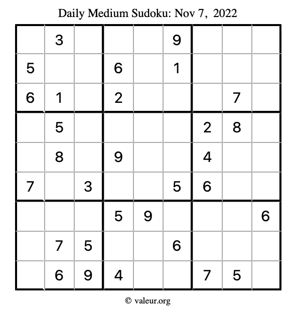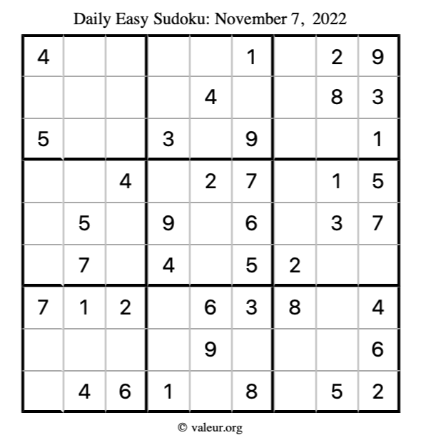 Here are the November 7, 2022 daily four sudoku puzzles. You are welcome to print a copy of the puzzles and solve them by hand. For your convenience, we have also included the solutions further down the page so you can check your work.