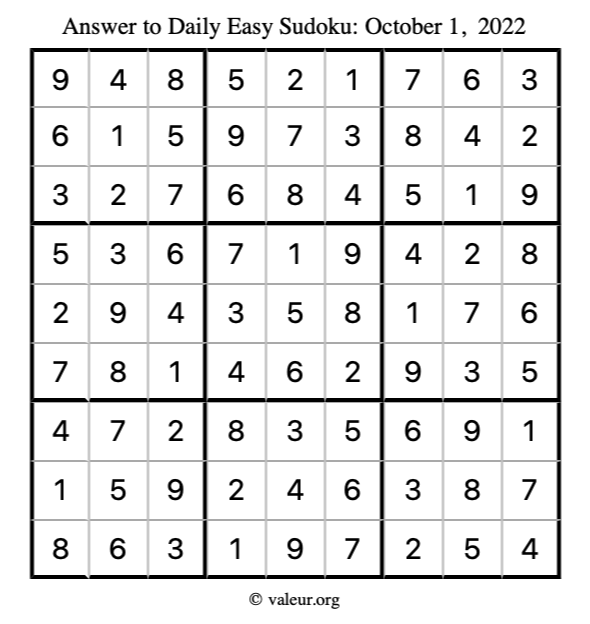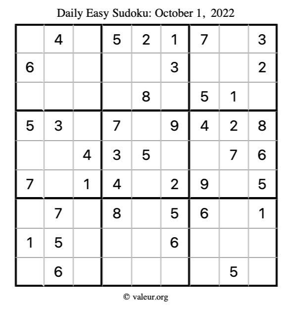 Here are the October 1, 2022 daily four sudoku puzzles. You are welcome to print a copy of the puzzles and solve them by hand. For your convenience, we have also included the solutions further down the page so you can check your work.