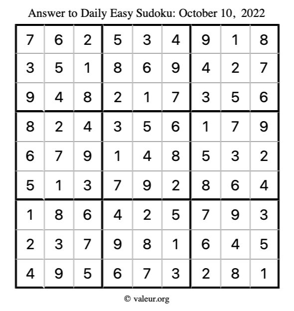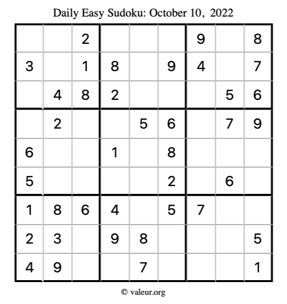 Here are the October 10, 2022 daily four sudoku puzzles. You are welcome to print a copy of the puzzles and solve them by hand. For your convenience, we have also included the solutions further down the page so you can check your work.