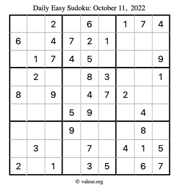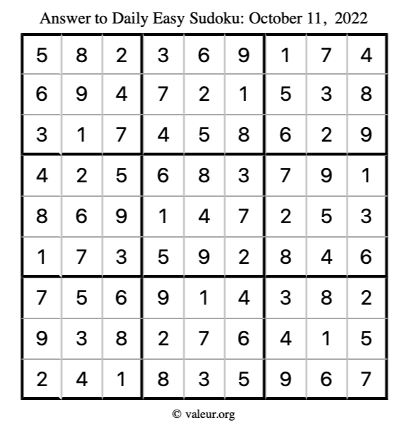 Here are the October 11, 2022 daily four sudoku puzzles. You are welcome to print a copy of the puzzles and solve them by hand. For your convenience, we have also included the solutions further down the page so you can check your work.