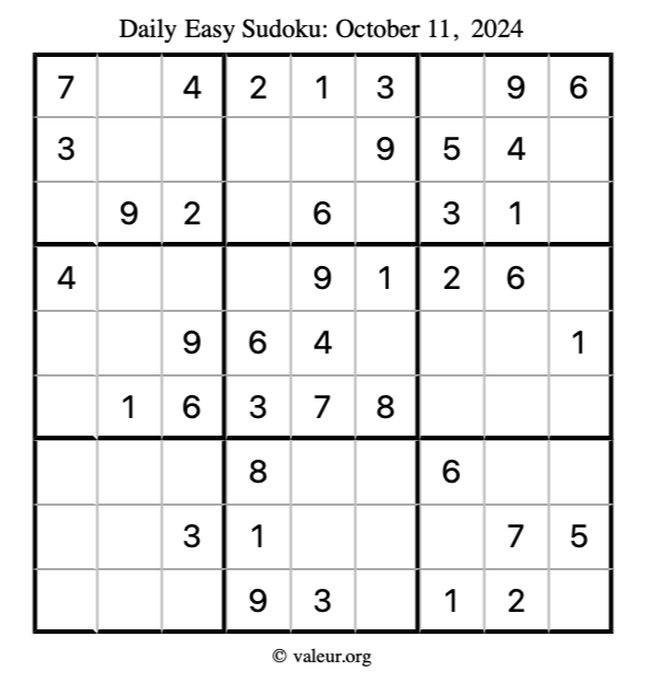 Here are the October 11, 2024 daily four sudoku puzzles. You are welcome to print a copy of the puzzles and solve them by hand. For your convenience, we have also included the solutions further down the page so you can check your work.