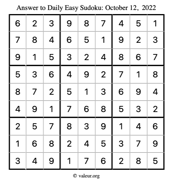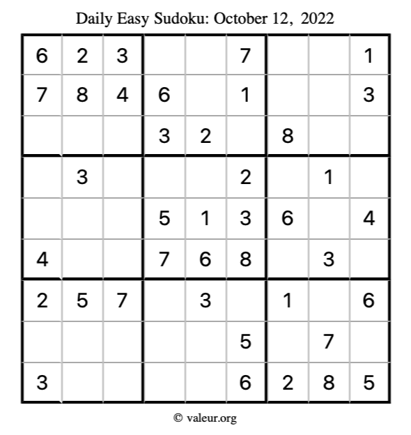Here are the October 12, 2022 daily four sudoku puzzles. You are welcome to print a copy of the puzzles and solve them by hand. For your convenience, we have also included the solutions further down the page so you can check your work.
