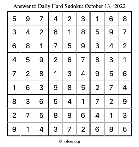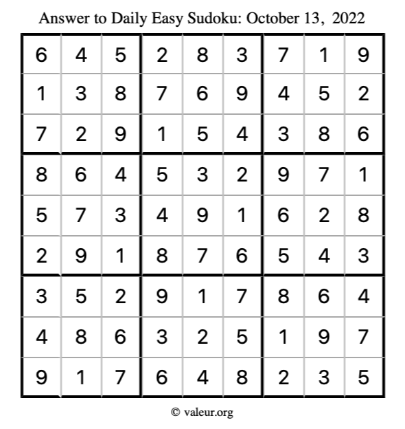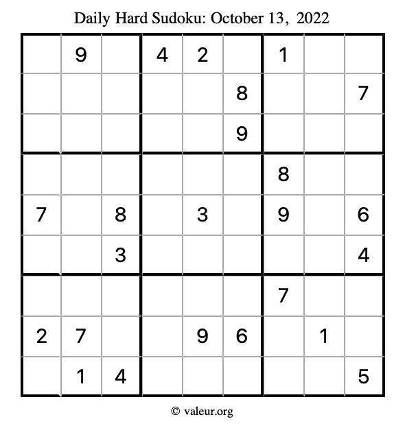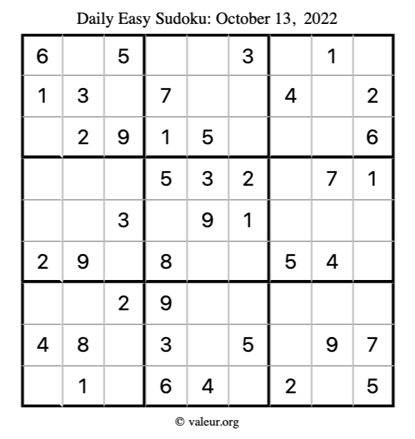 Here are the October 13, 2022 daily four sudoku puzzles. You are welcome to print a copy of the puzzles and solve them by hand. For your convenience, we have also included the solutions further down the page so you can check your work.