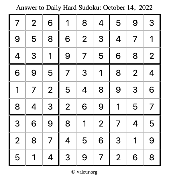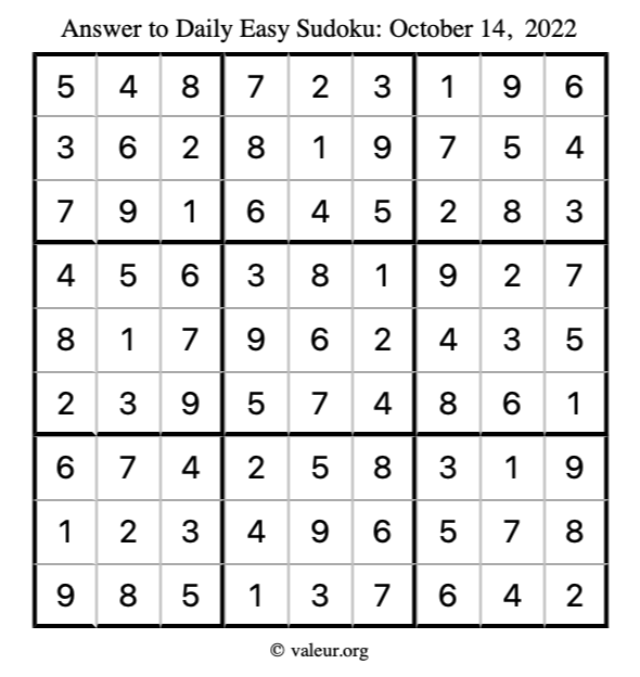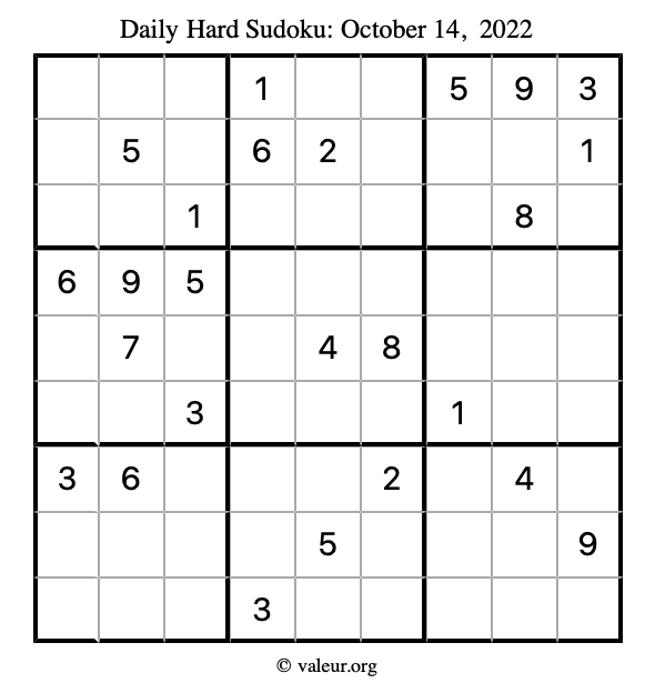 Here are the October 14, 2022 daily four sudoku puzzles. You are welcome to print a copy of the puzzles and solve them by hand. For your convenience, we have also included the solutions further down the page so you can check your work.