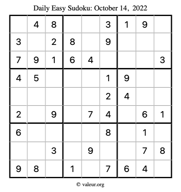 Daily Four Sudoku Puzzles October 14, 2022 is not the only daily set of sudoku puzzles we have. We create four sudoku puzzles every day for you to print and solve. Check out today's set of four sudoku puzzles here!