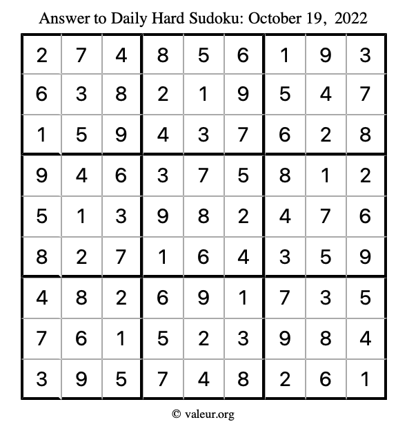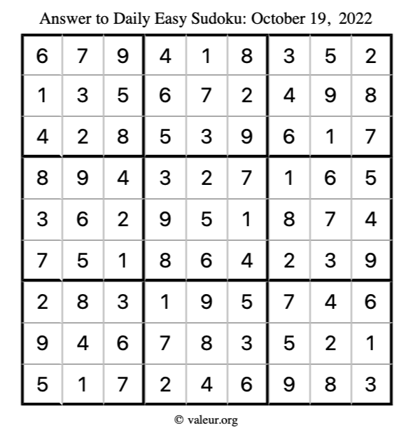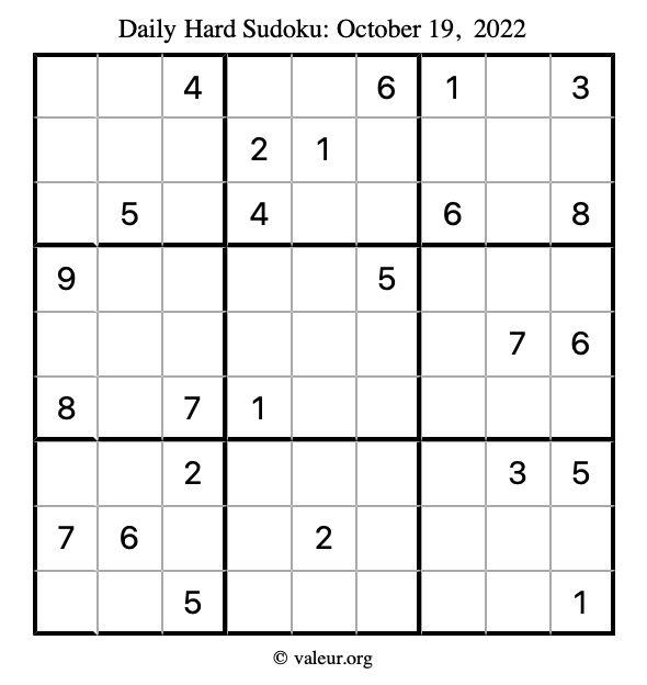 Here are the October 19, 2022 daily four sudoku puzzles. You are welcome to print a copy of the puzzles and solve them by hand. For your convenience, we have also included the solutions further down the page so you can check your work.