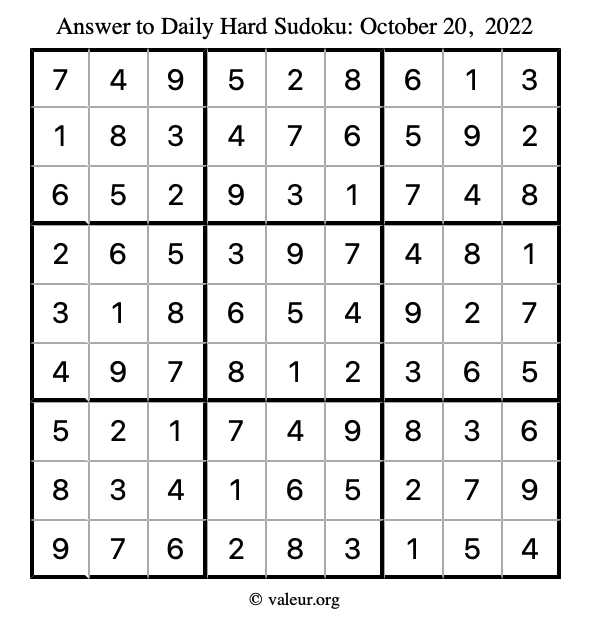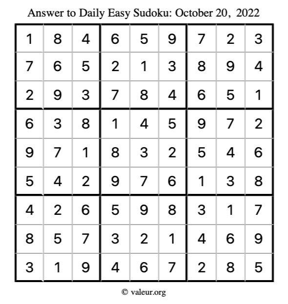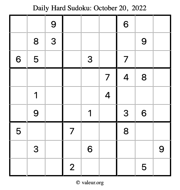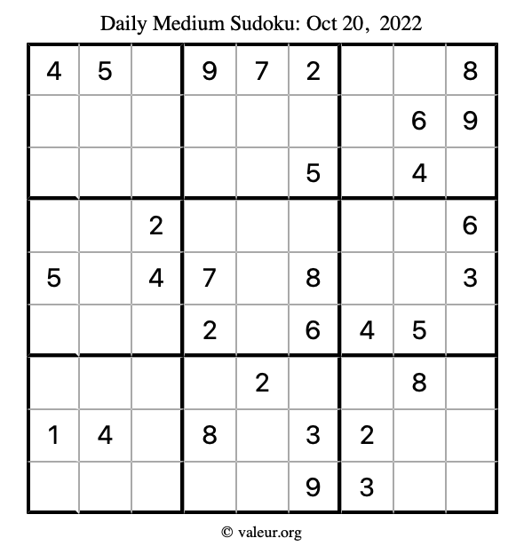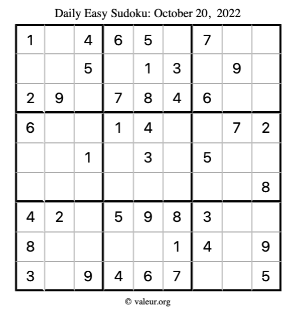 Here are the October 20, 2022 daily four sudoku puzzles. You are welcome to print a copy of the puzzles and solve them by hand. For your convenience, we have also included the solutions further down the page so you can check your work.