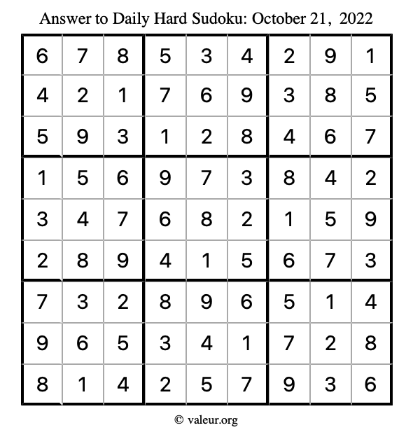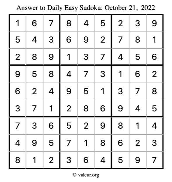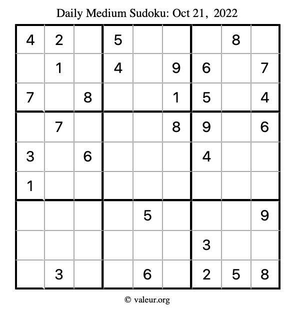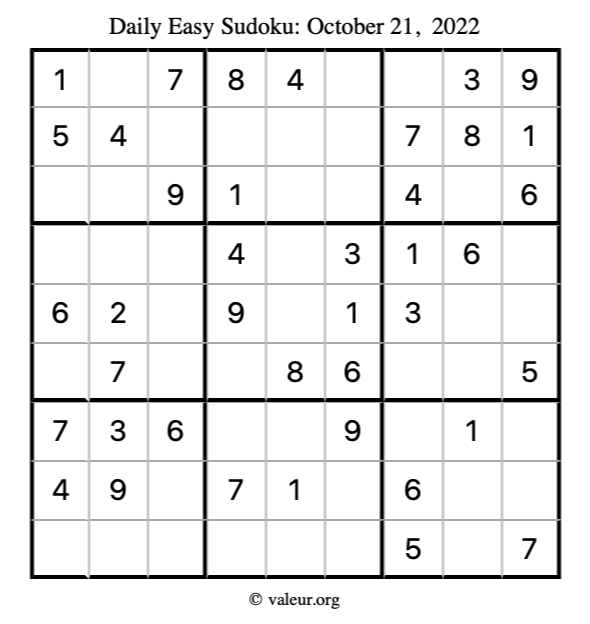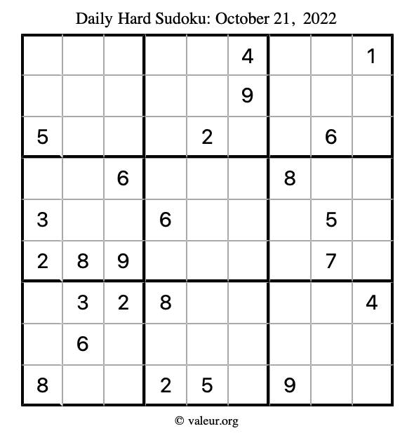 Here are the October 21, 2022 daily four sudoku puzzles. You are welcome to print a copy of the puzzles and solve them by hand. For your convenience, we have also included the solutions further down the page so you can check your work.