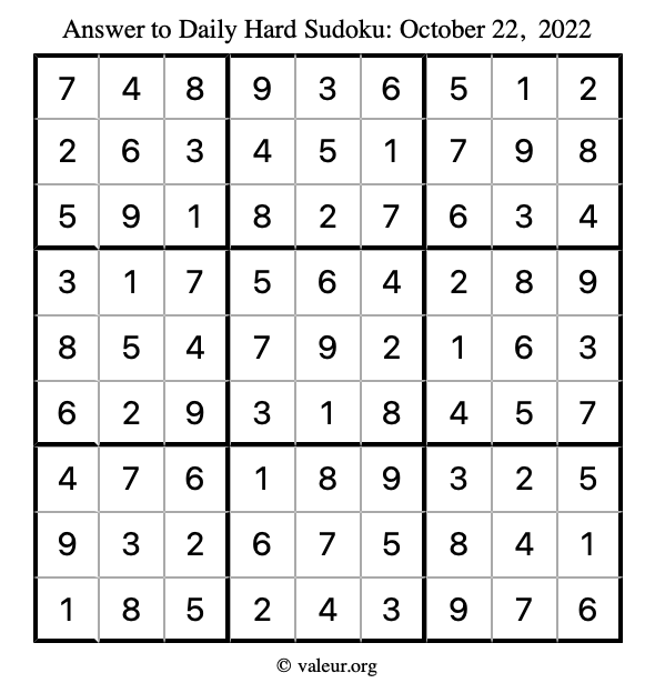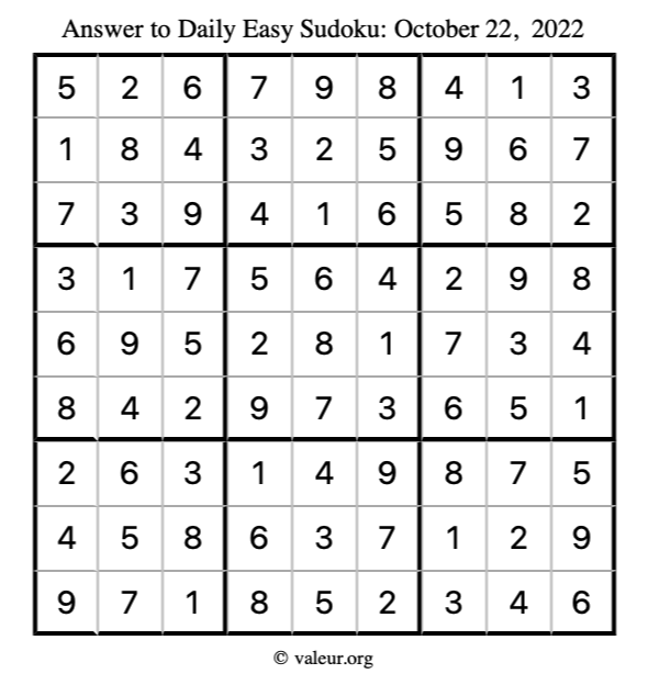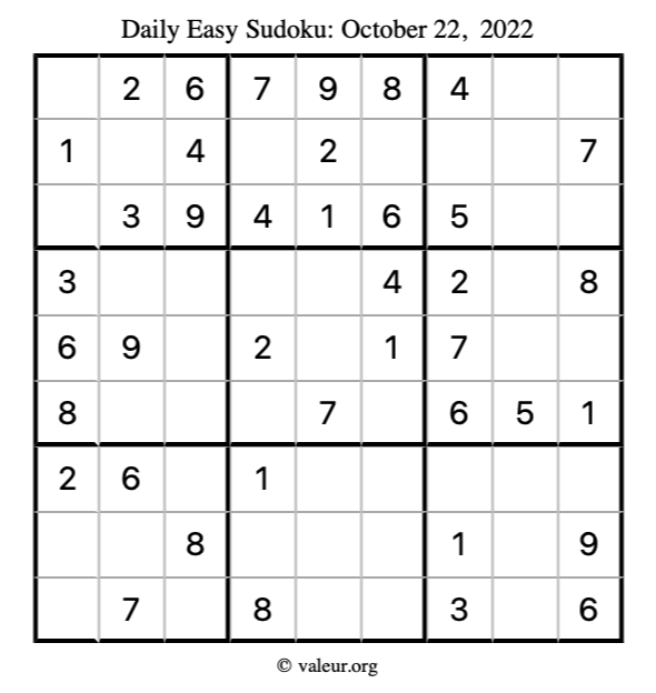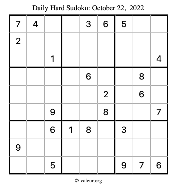 Here are the October 22, 2022 daily four sudoku puzzles. You are welcome to print a copy of the puzzles and solve them by hand. For your convenience, we have also included the solutions further down the page so you can check your work.