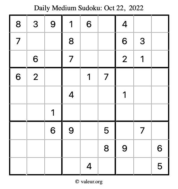 Daily Four Sudoku Puzzles October 22, 2022 is not the only daily set of sudoku puzzles we have. We create four sudoku puzzles every day for you to print and solve. Check out today's set of four sudoku puzzles here!