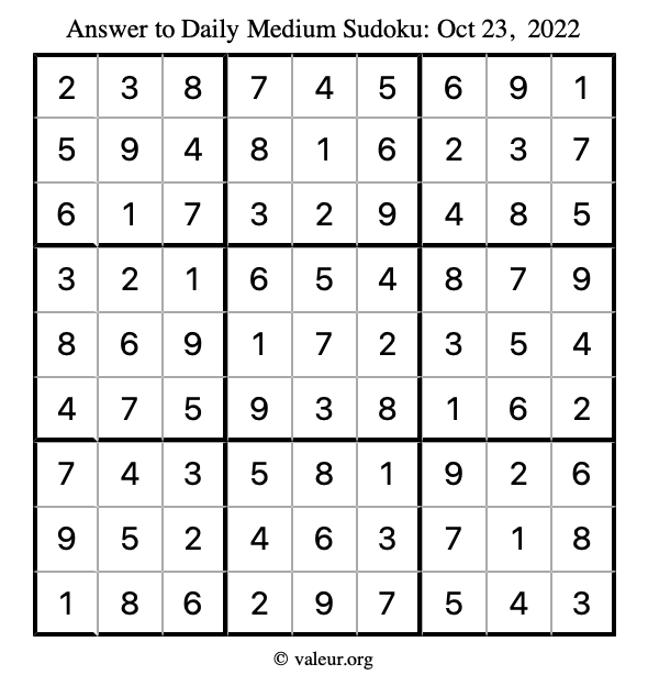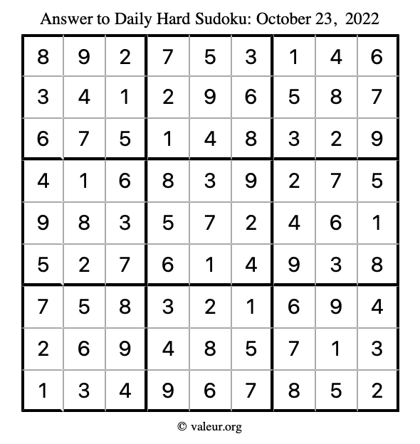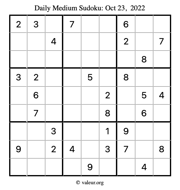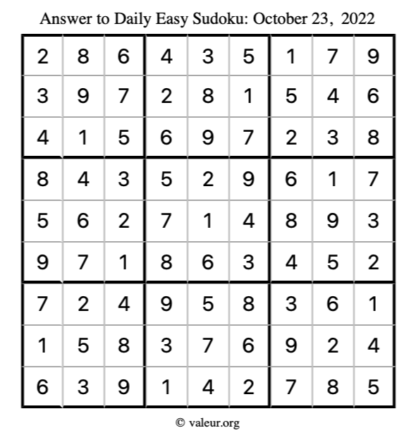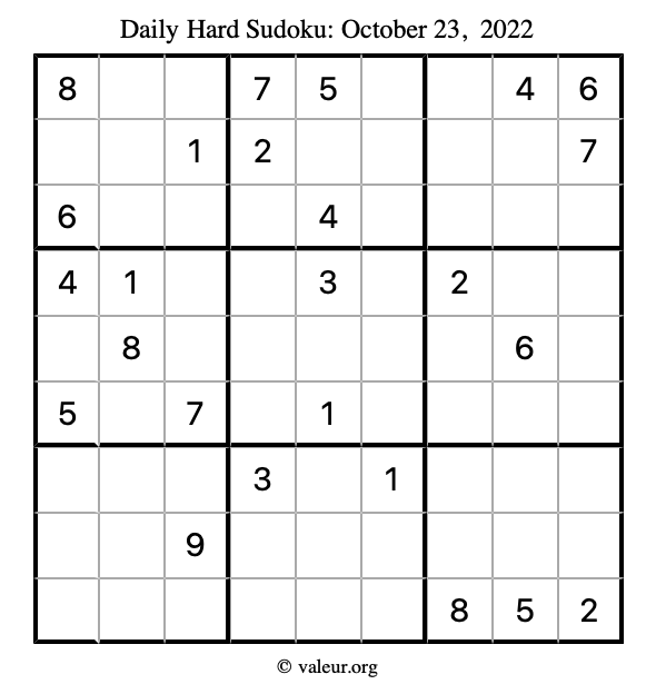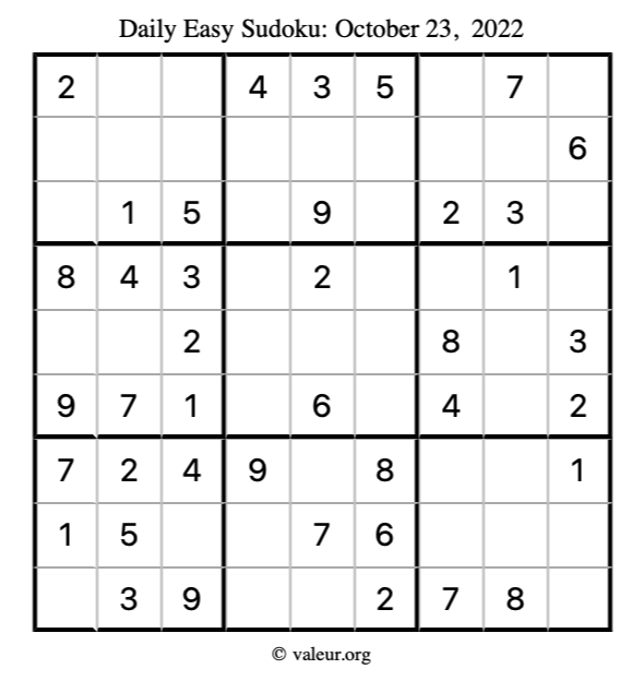 Here are the October 23, 2022 daily four sudoku puzzles. You are welcome to print a copy of the puzzles and solve them by hand. For your convenience, we have also included the solutions further down the page so you can check your work.