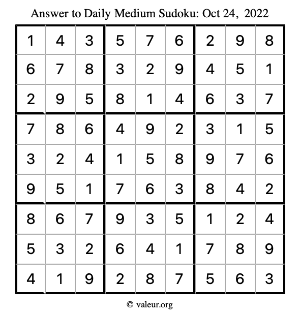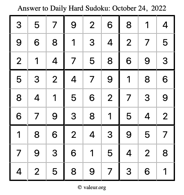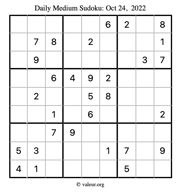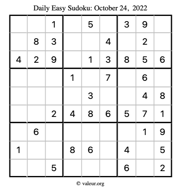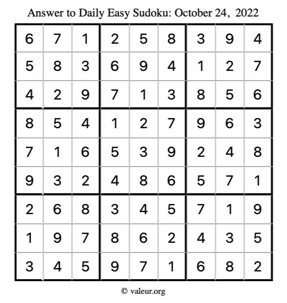 Here are the October 24, 2022 daily four sudoku puzzles. You are welcome to print a copy of the puzzles and solve them by hand. For your convenience, we have also included the solutions further down the page so you can check your work.