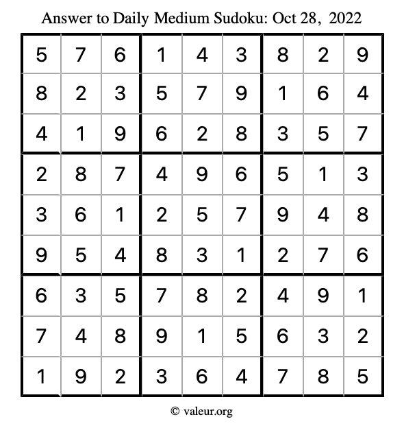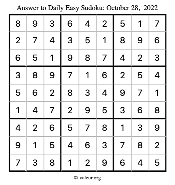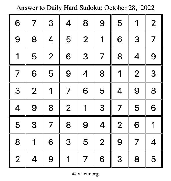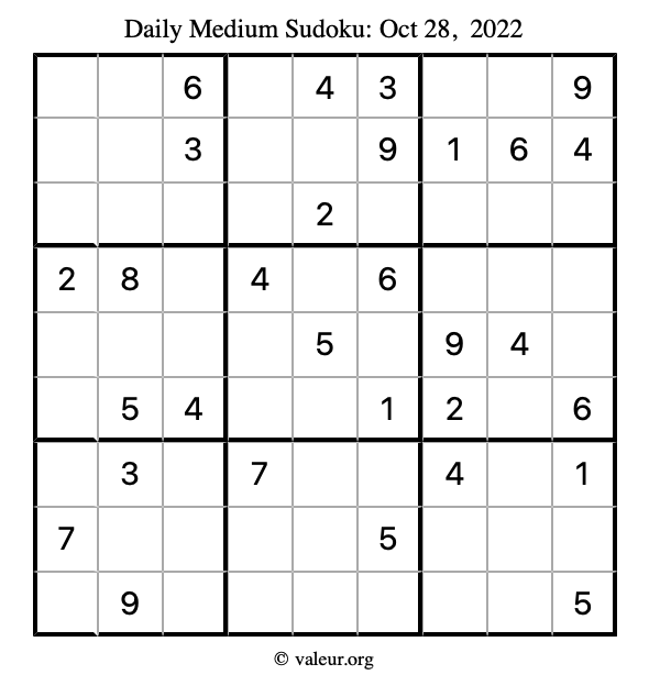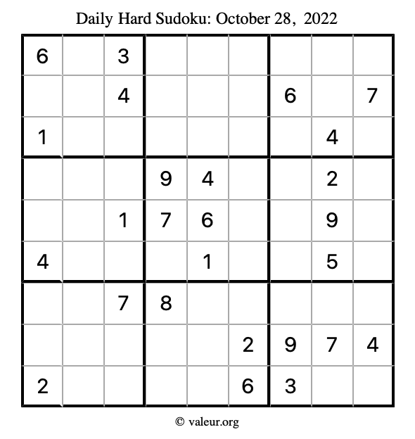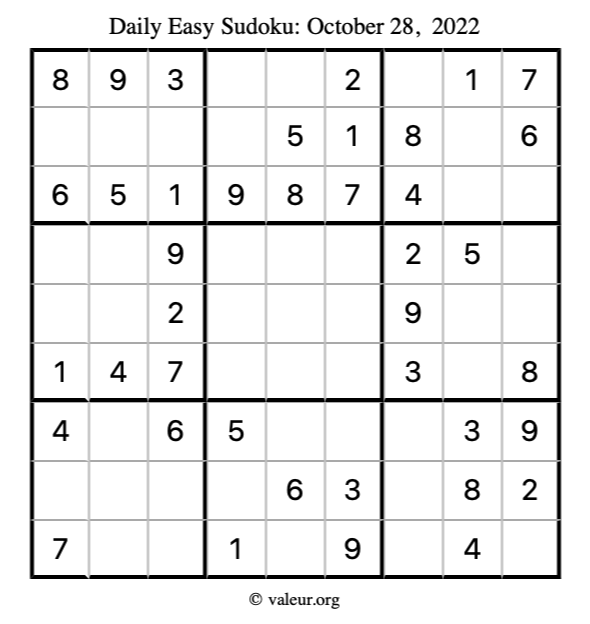 Here are the October 28, 2022 daily four sudoku puzzles. You are welcome to print a copy of the puzzles and solve them by hand. For your convenience, we have also included the solutions further down the page so you can check your work.