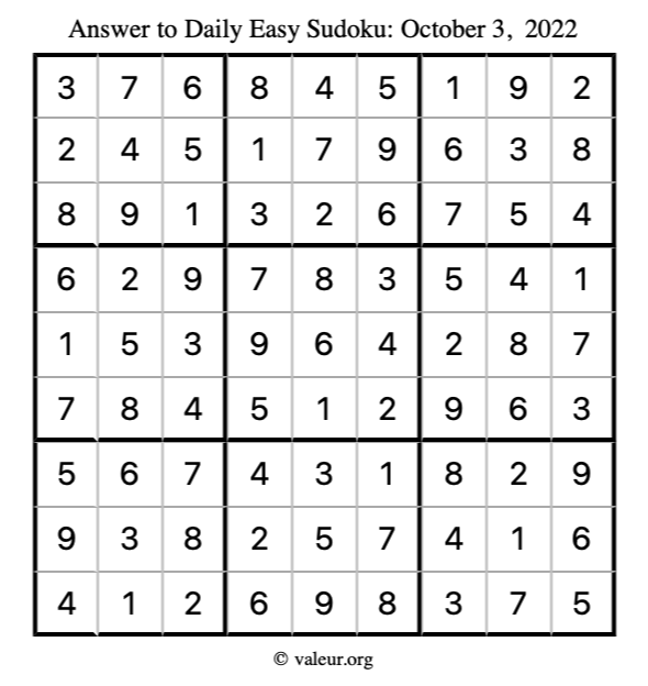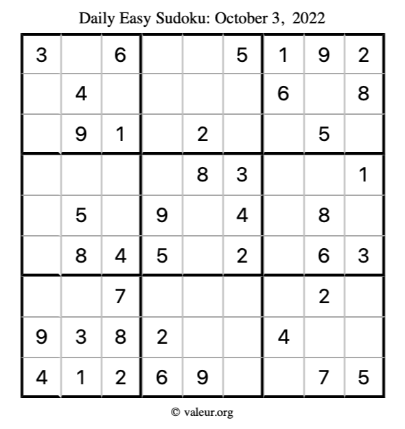 Here are the October 3, 2022 daily four sudoku puzzles. You are welcome to print a copy of the puzzles and solve them by hand. For your convenience, we have also included the solutions further down the page so you can check your work.