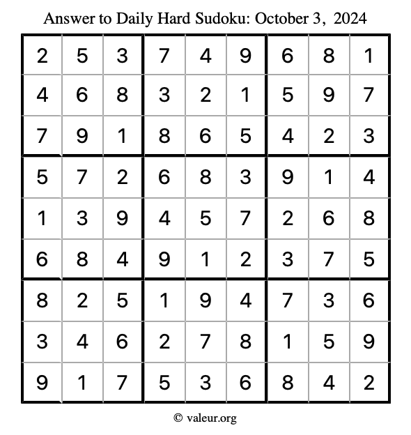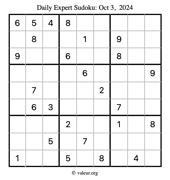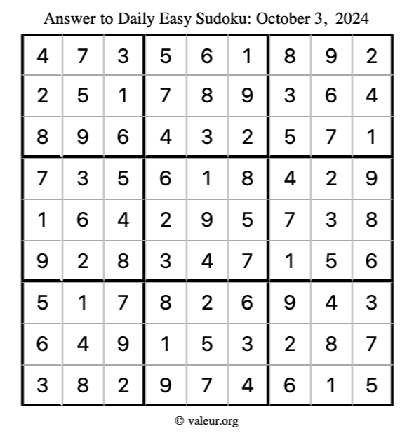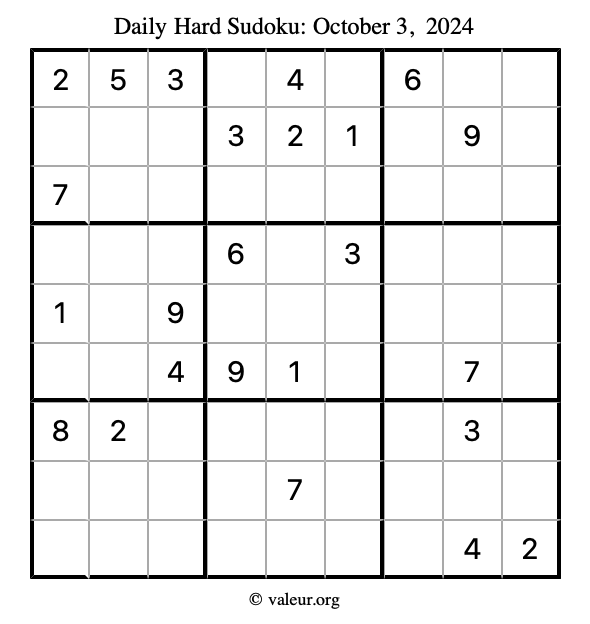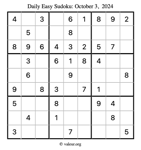 Here are the October 3, 2024 daily four sudoku puzzles. You are welcome to print a copy of the puzzles and solve them by hand. For your convenience, we have also included the solutions further down the page so you can check your work.