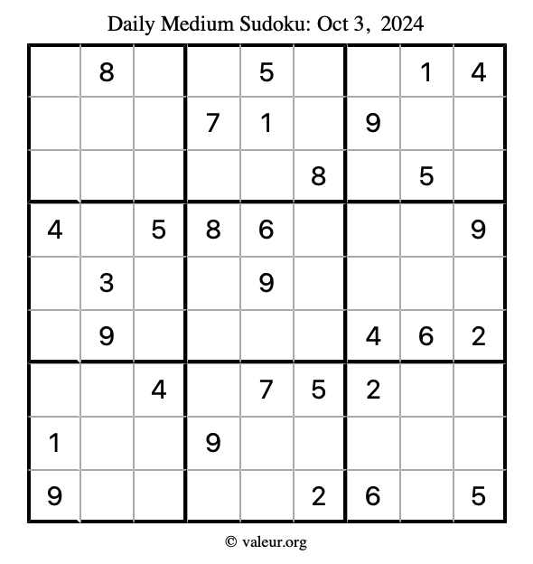 Daily Four Sudoku Puzzles October 3, 2024 is not the only daily set of sudoku puzzles we have. We create four sudoku puzzles every day for you to print and solve. Check out today's set of four sudoku puzzles here!