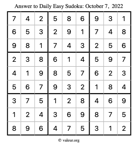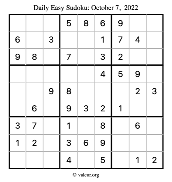 Here are the October 7, 2022 daily four sudoku puzzles. You are welcome to print a copy of the puzzles and solve them by hand. For your convenience, we have also included the solutions further down the page so you can check your work.