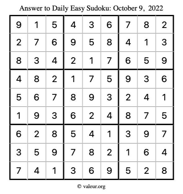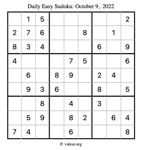 Here are the October 9, 2022 daily four sudoku puzzles. You are welcome to print a copy of the puzzles and solve them by hand. For your convenience, we have also included the solutions further down the page so you can check your work.