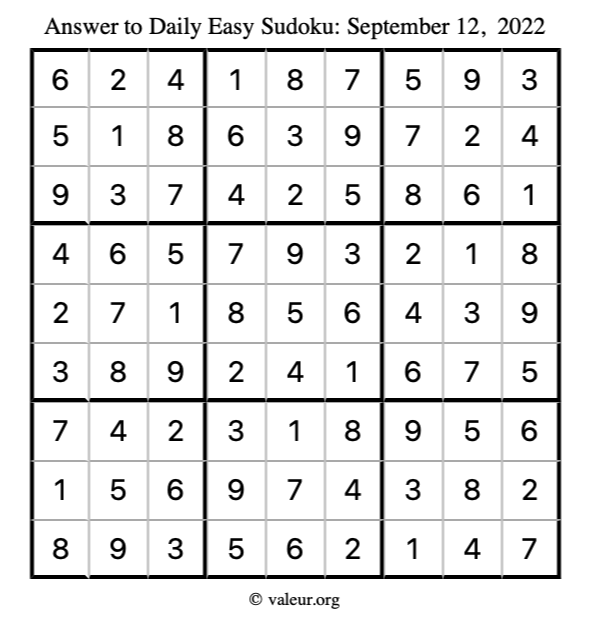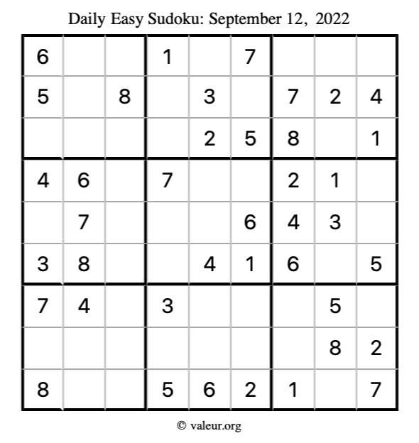 Here are the September 12, 2022 daily four sudoku puzzles. You are welcome to print a copy of the puzzles and solve them by hand. For your convenience, we have also included the solutions further down the page so you can check your work.
