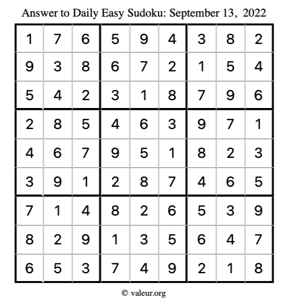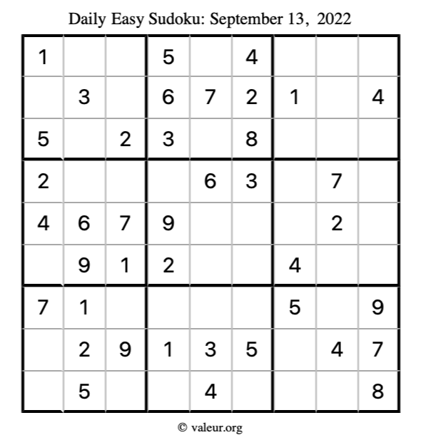 Here are the September 13, 2022 daily four sudoku puzzles. You are welcome to print a copy of the puzzles and solve them by hand. For your convenience, we have also included the solutions further down the page so you can check your work.