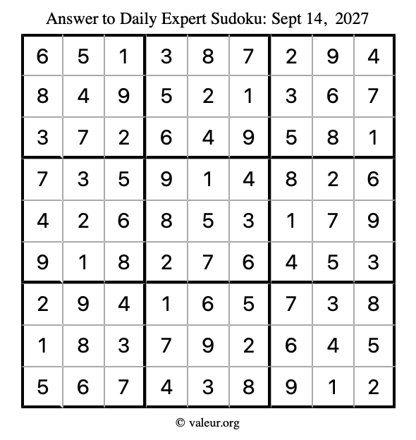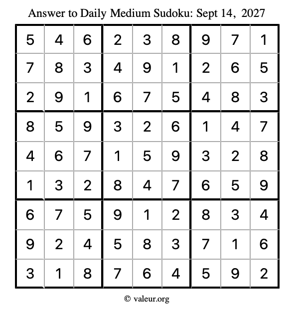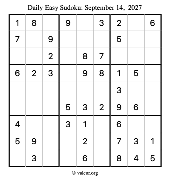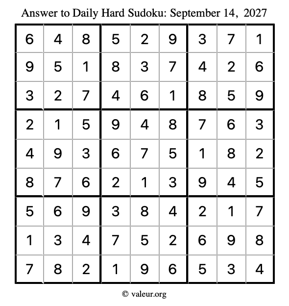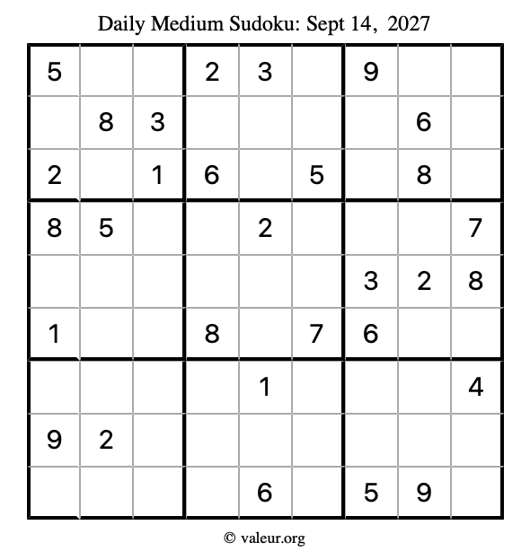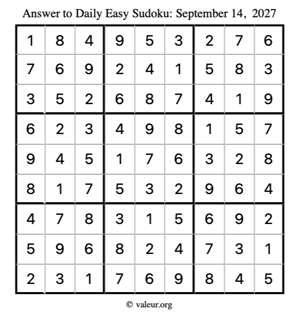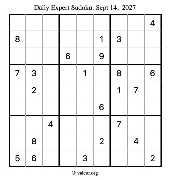 Here are the September 14, 2027 daily four sudoku puzzles. You are welcome to print a copy of the puzzles and solve them by hand. For your convenience, we have also included the solutions further down the page so you can check your work.